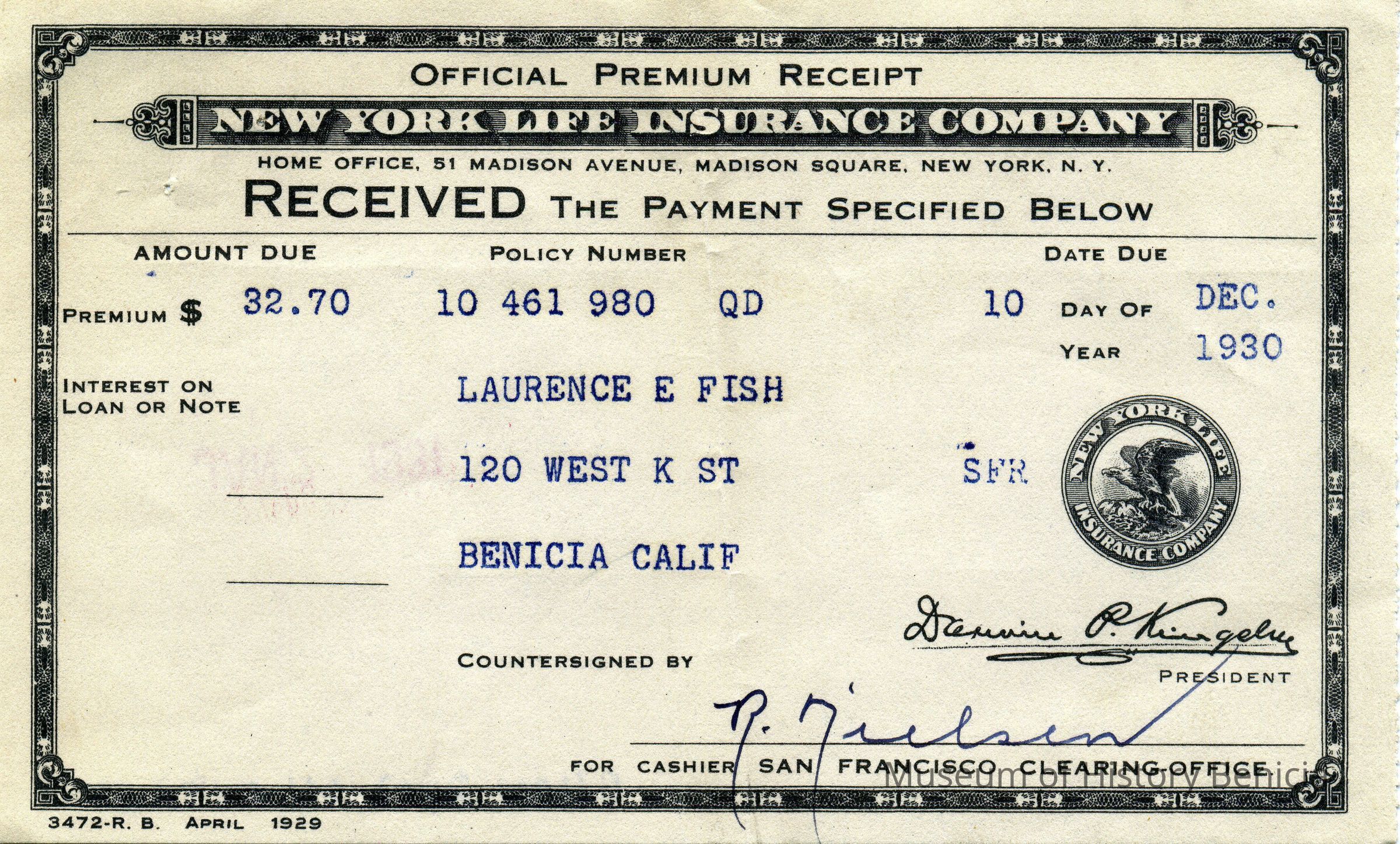 Receipts from New York Life Insurance Company from 05/23/1930 to 12/10/1934. Most are for payment of premiums and a few are for dividends paid at the end of a year. All are for Lawerence and Ardella Fish.Collection