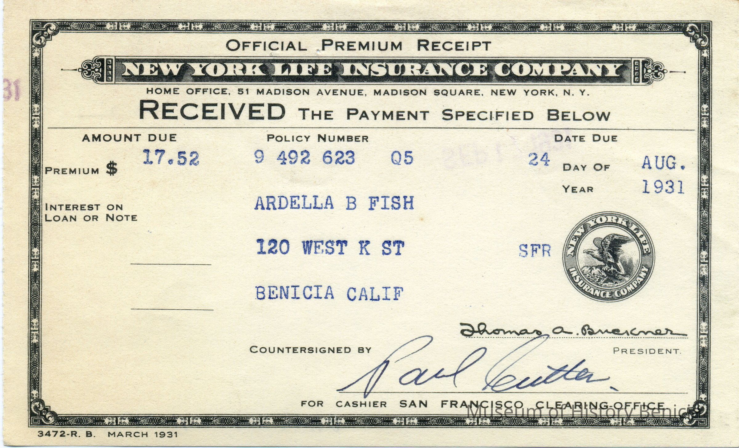 Receipts from New York Life Insurance Company from 05/23/1930 to 12/10/1934. Most are for payment of premiums and a few are for dividends paid at the end of a year. All are for Lawerence and Ardella Fish.Collection