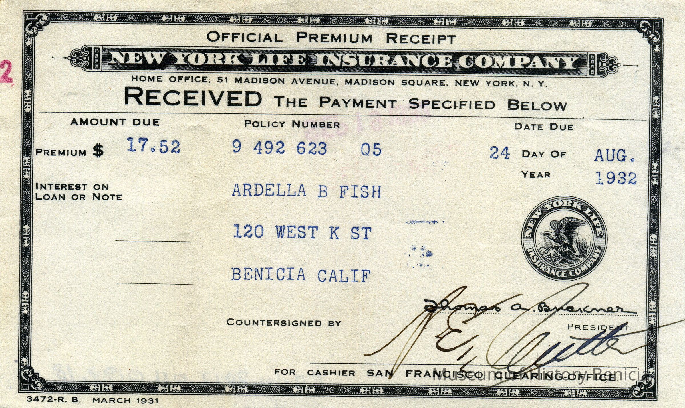 Receipts from New York Life Insurance Company from 05/23/1930 to 12/10/1934. Most are for payment of premiums and a few are for dividends paid at the end of a year. All are for Lawerence and Ardella Fish.Collection