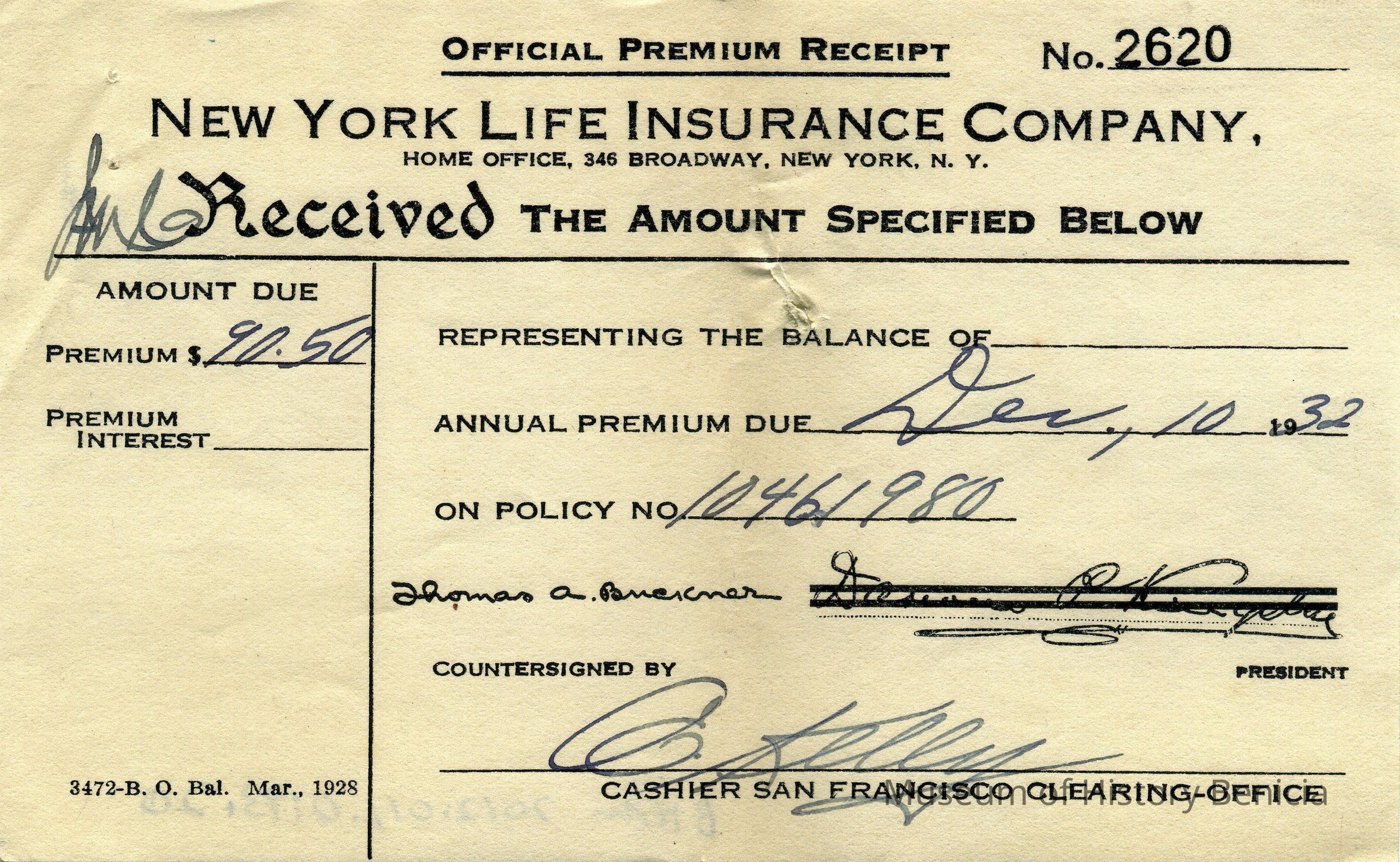 Receipts from New York Life Insurance Company from 05/23/1930 to 12/10/1934. Most are for payment of premiums and a few are for dividends paid at the end of a year. All are for Lawerence and Ardella Fish.Collection
