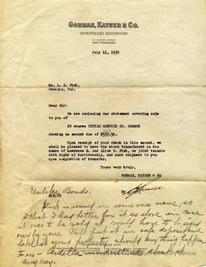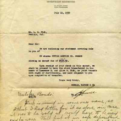 Receipts from Cities Service Company common stock. The receipts are for dividends paid on shares of Cities common stock in 1931. There is also a letter dated 07/11/1930 showing the purchase of 20 shares of Cities stock by L.E. Fish in Benicia Ca. for $537.50.