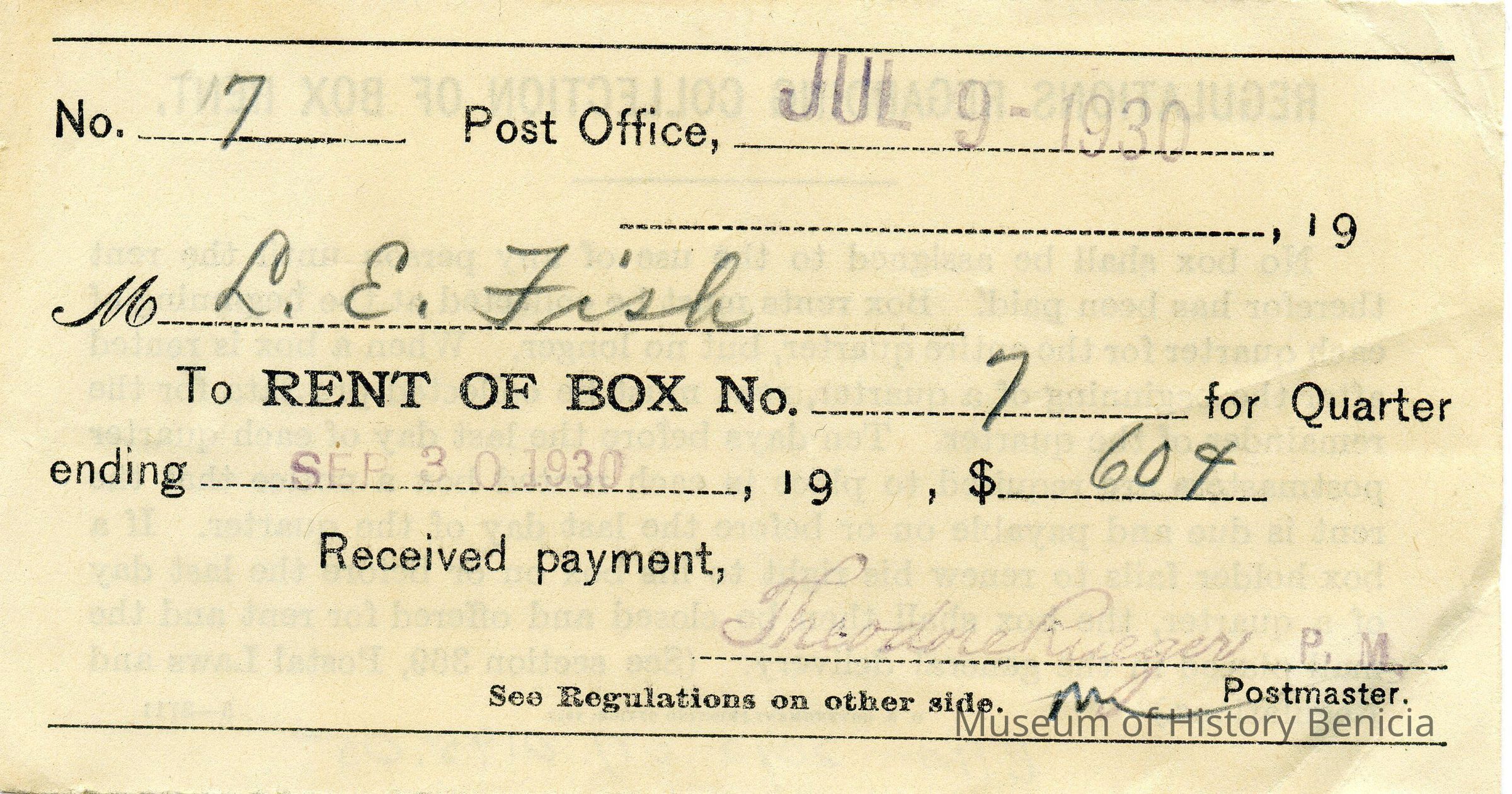 Receipts from Post Office Box rentals in Benicia by LE Fish for 1930-1933. All for box no. 7 and for $.60 per quarter.