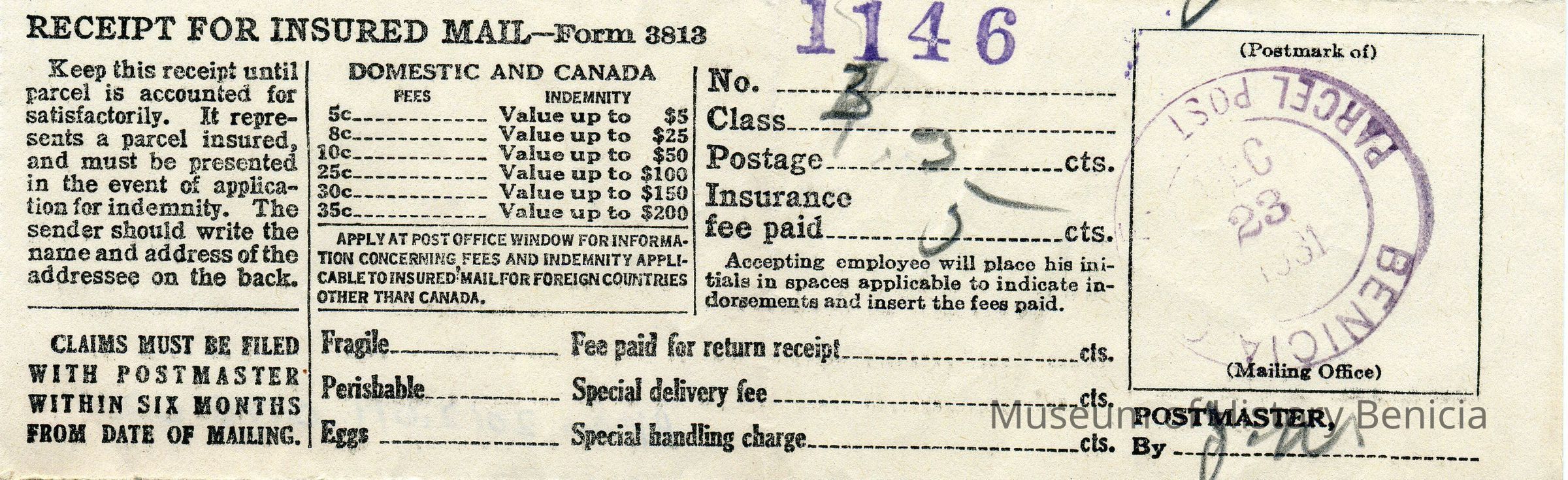 Receipts from insured mail in Beniciaprobably by LE Fish for 1929-1933.