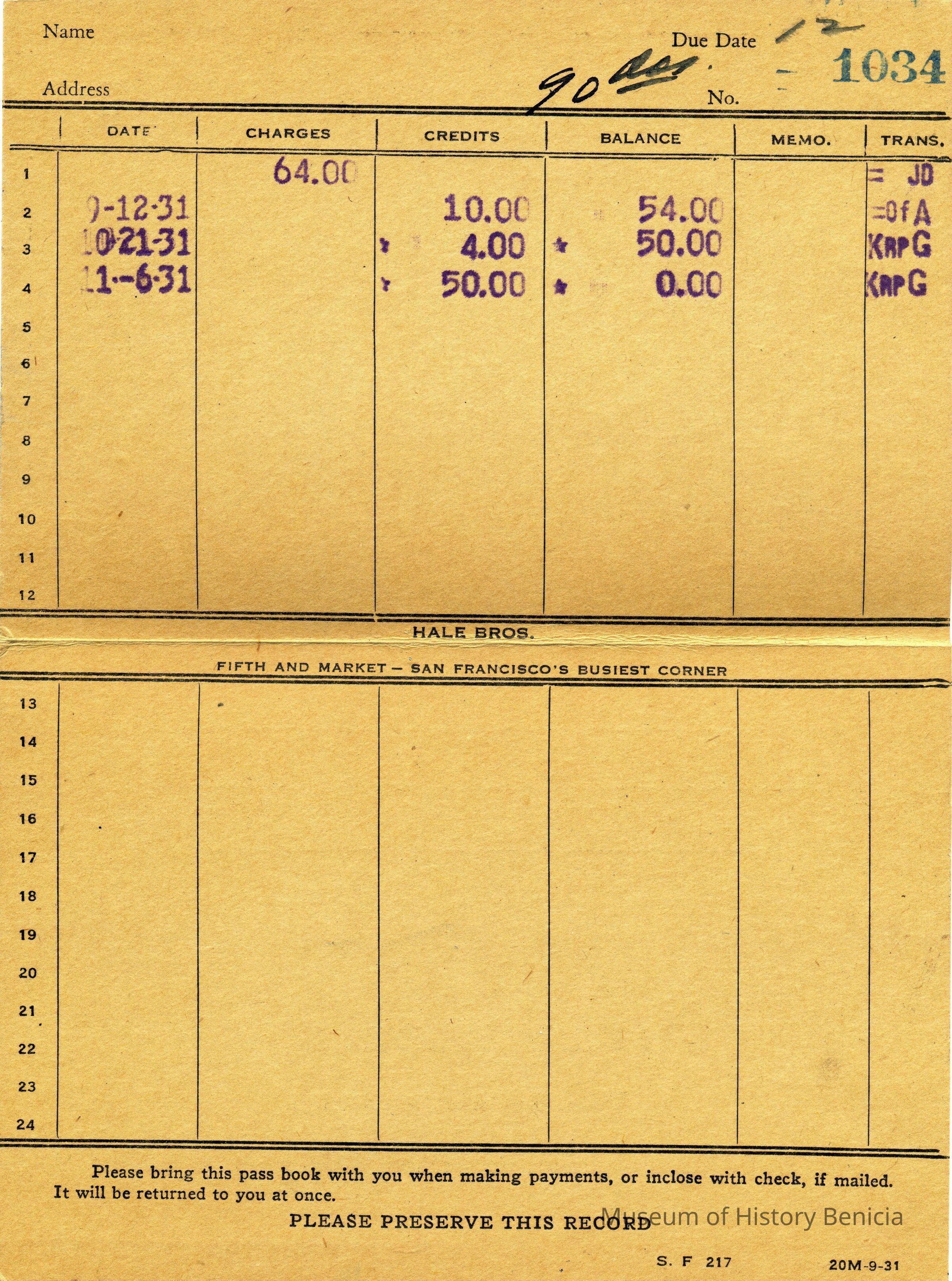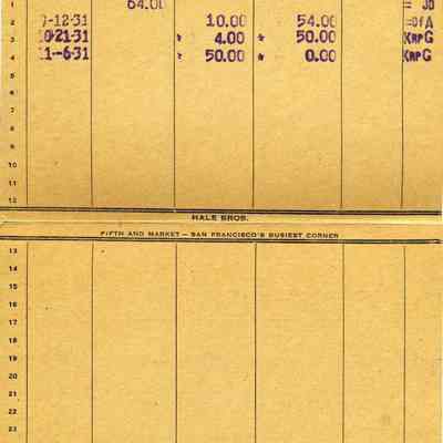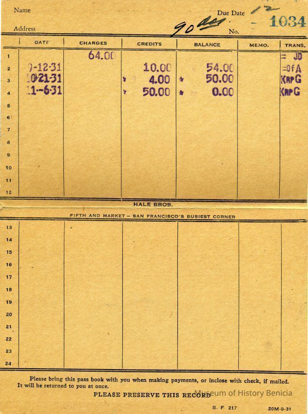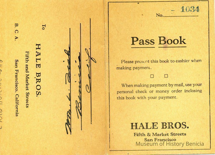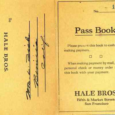 Receipts, Bills of Sale, and Pass Books for the Hale Brothers at Fifth & Market in San Francisco. Most are from 1931 and all are made out to Mrs LE Fish of Benicia.Collection
