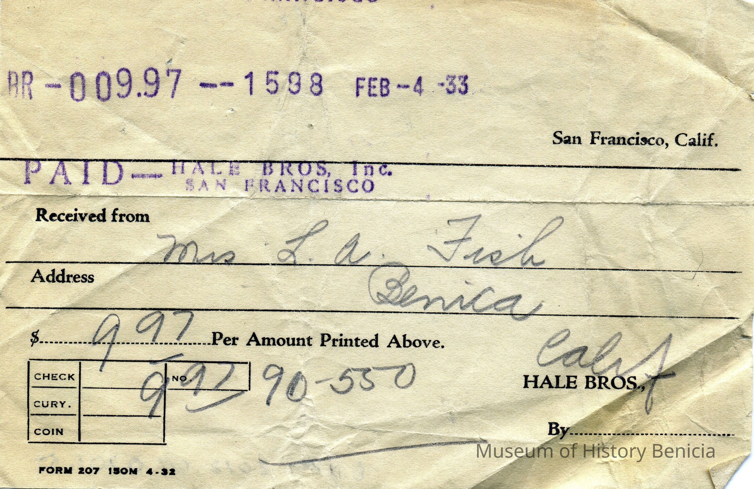 Receipts, Bills of Sale, and Pass Books for the Hale Brothers at Fifth & Market in San Francisco. Most are from 1931 and all are made out to Mrs LE Fish of Benicia.Collection