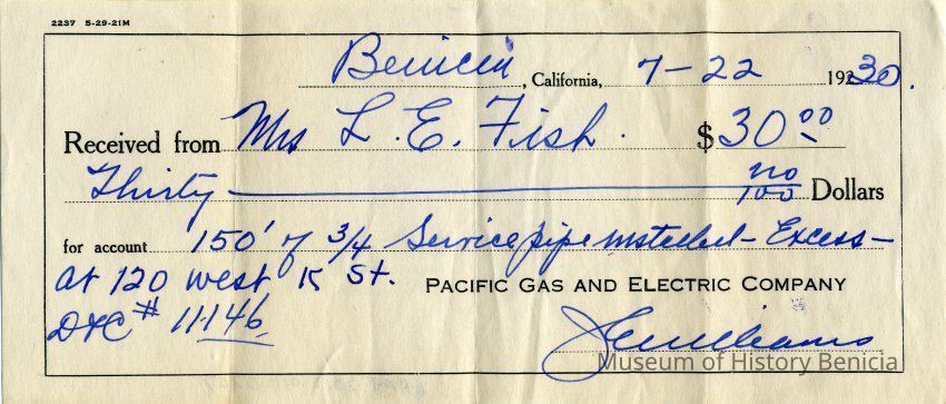Receipt from Pacific Gas & Electric dated 07/22/1930 for 150 feet of service pipe installed at 120 West K st. Cost $30.00