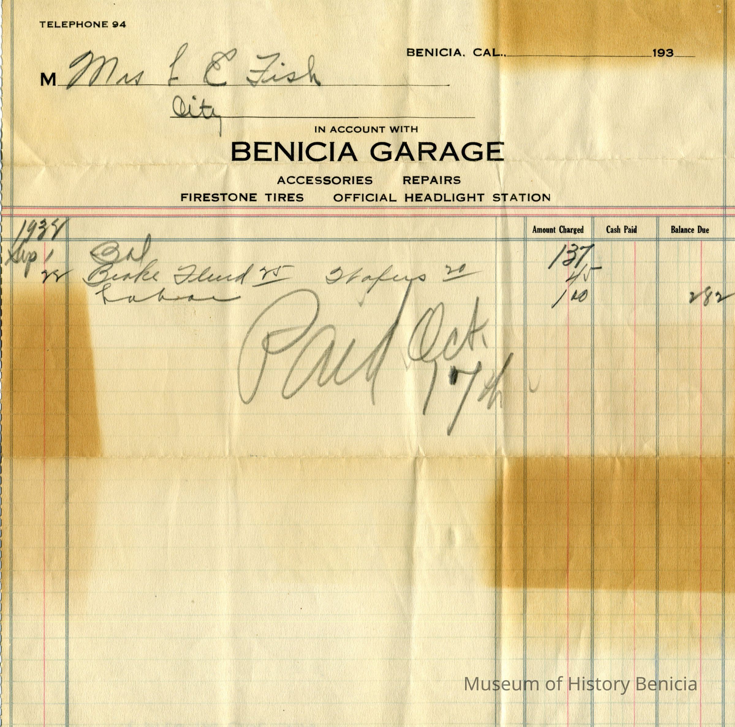 Receipt from Benicia Garage for auto services and supplies. Dated from 1930-1934. Made out to Mrs L Fish. Some dated 1932 and 1933 show M Passalacqua prop.Collection