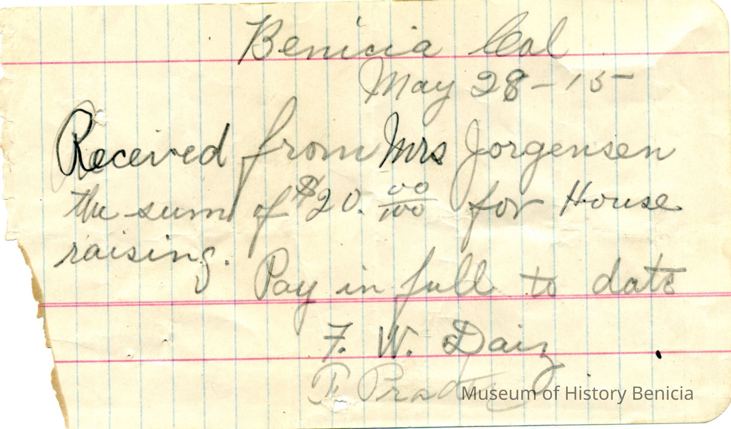 Receipt fromF W Daiz to Mrs Jorgensen for raising her house at the cost of $20 dated 05/28/1915.