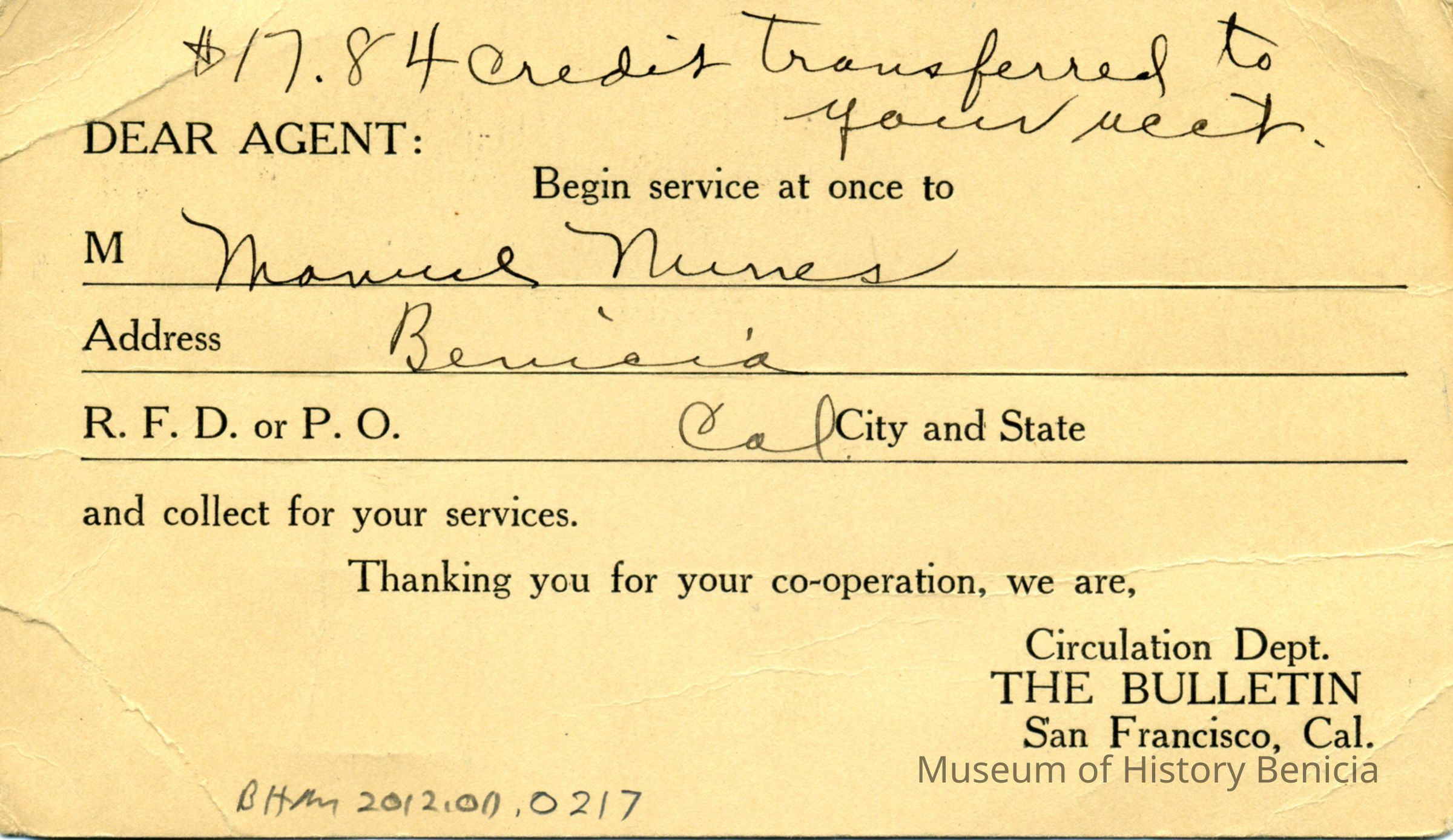Receipts from various area newspapers to Mrs LE Fish over a period from 1929 to 1934 (one card is from June 1927 and is from the SF Bulletin circulation dept.). Newspapers include: