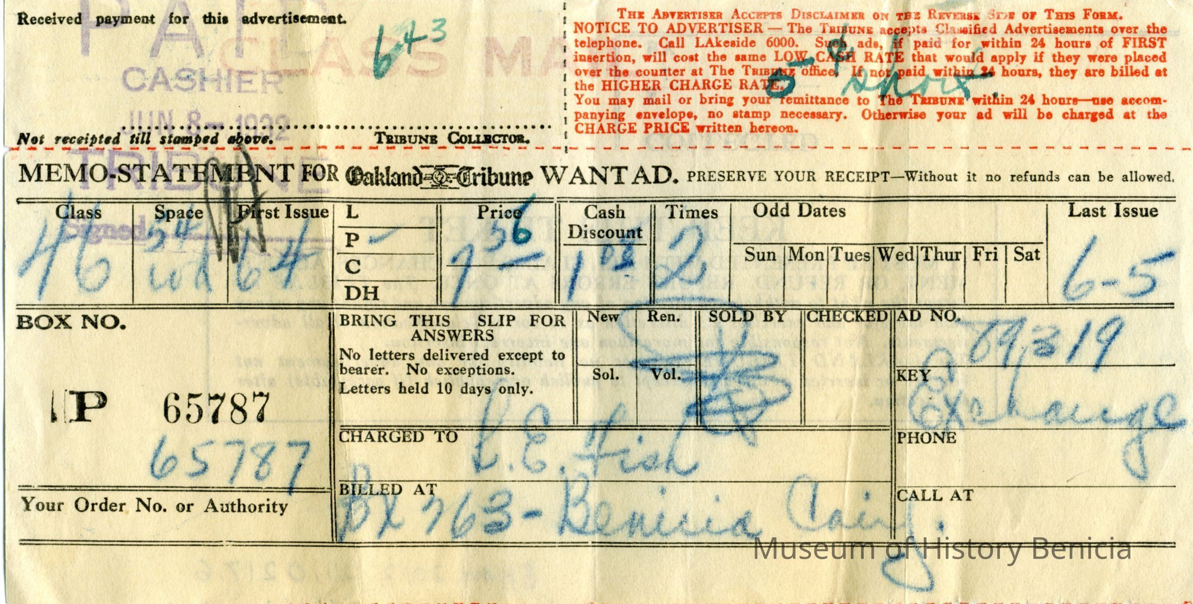 Receipts from various area newspapers to Mrs LE Fish over a period from 1929 to 1934 (one card is from June 1927 and is from the SF Bulletin circulation dept.). Newspapers include: