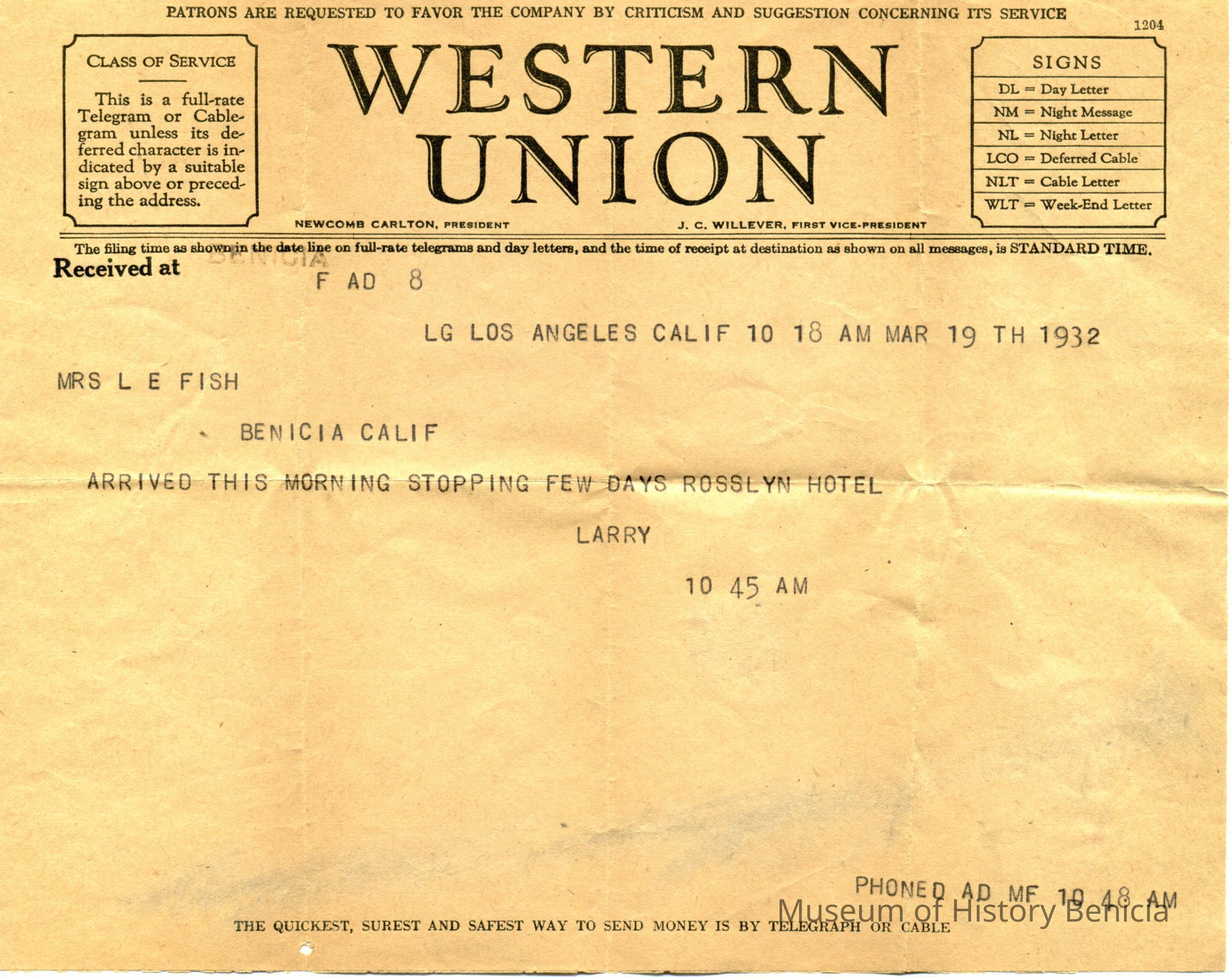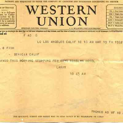 Western Union telegram dated 1932 to Mrs LE Fish and says Arrived this morning stopping few days Rosslyn Hotel. signed Larry