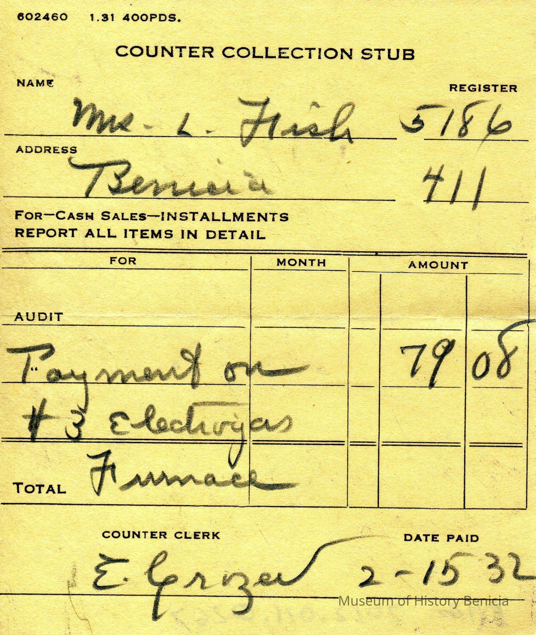 Receipt for $79.08 dated 02/15/1932 for payment on furnance. It is to Mrs L Fish of Benicia CA.