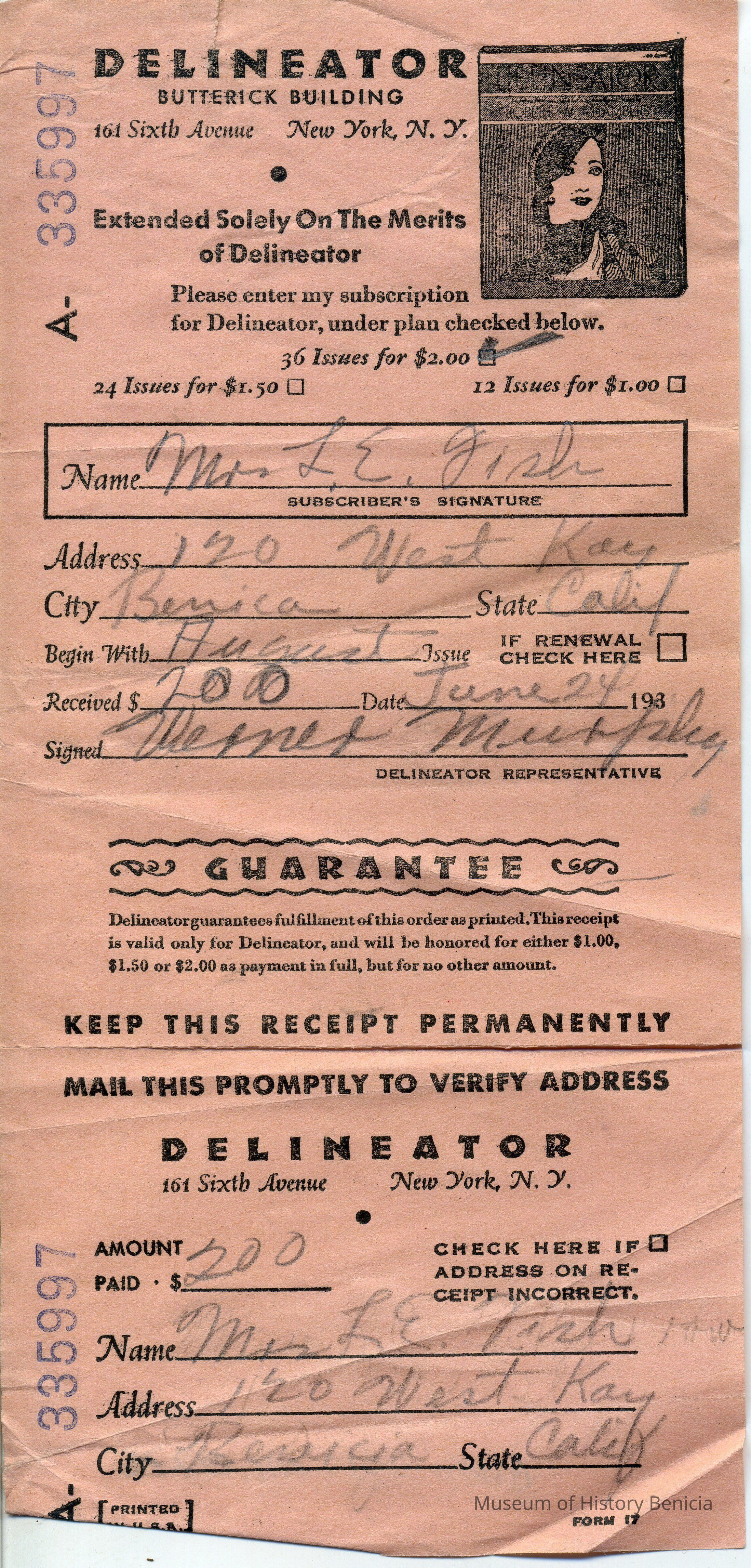 Receipt for $2.00 dated 06/24/193x from Delineator in the Buttrick Building..