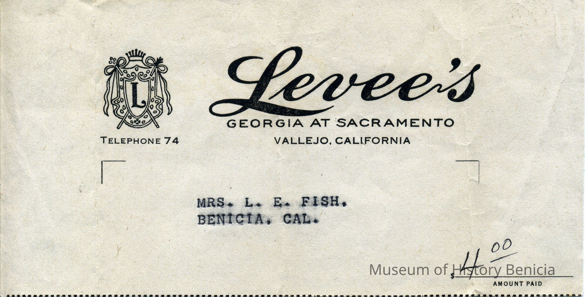 Receipt for $4.00 dated no date from Levee's on Georgia street at Sacrament in Vallejo CA to Mrs LE Fish