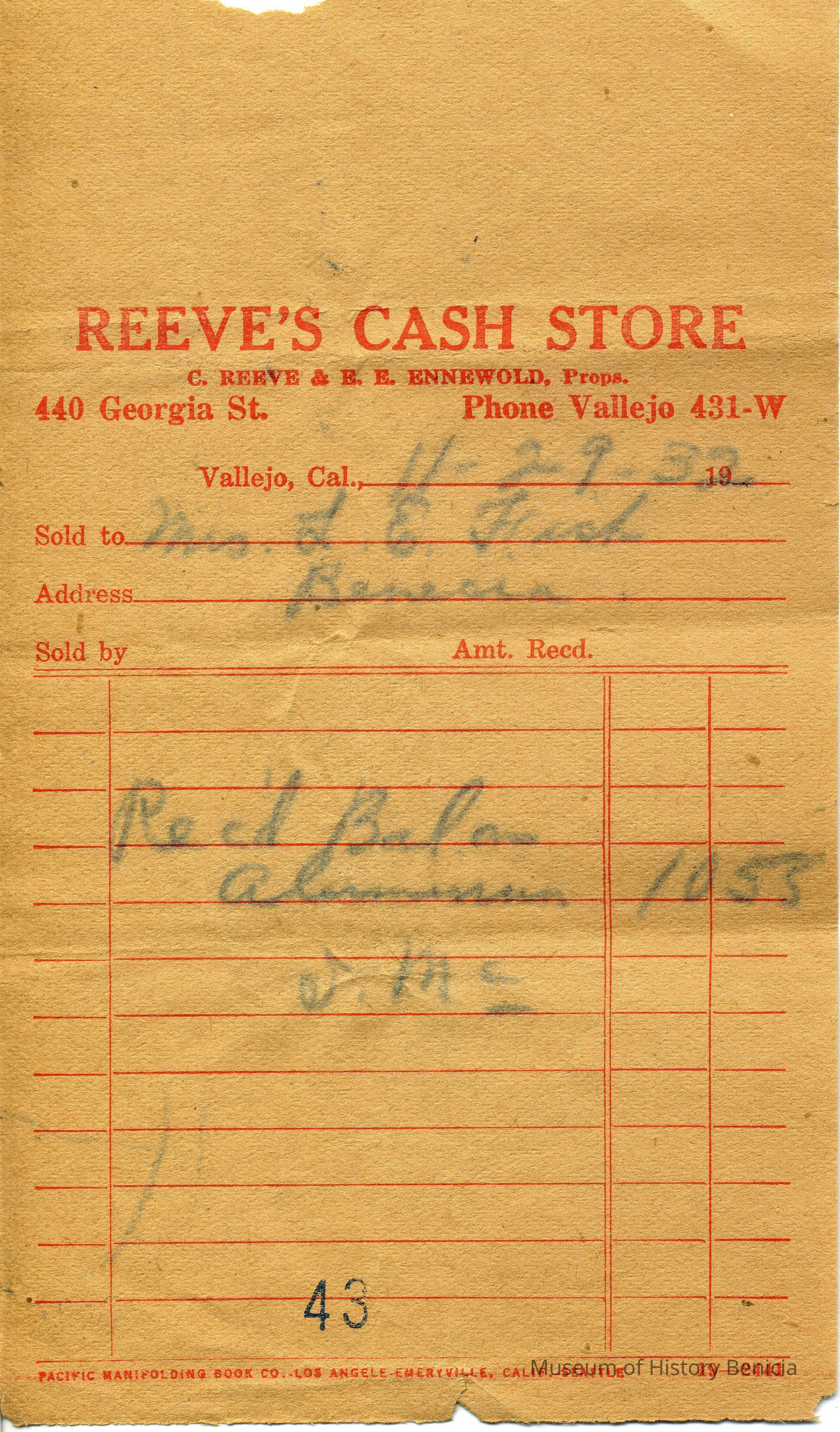Receipt for $10.55 dated 11/29/1932 from Reeve's Cash Store at 440 Georgia St Vallejo, CA to Mrs LE Fish