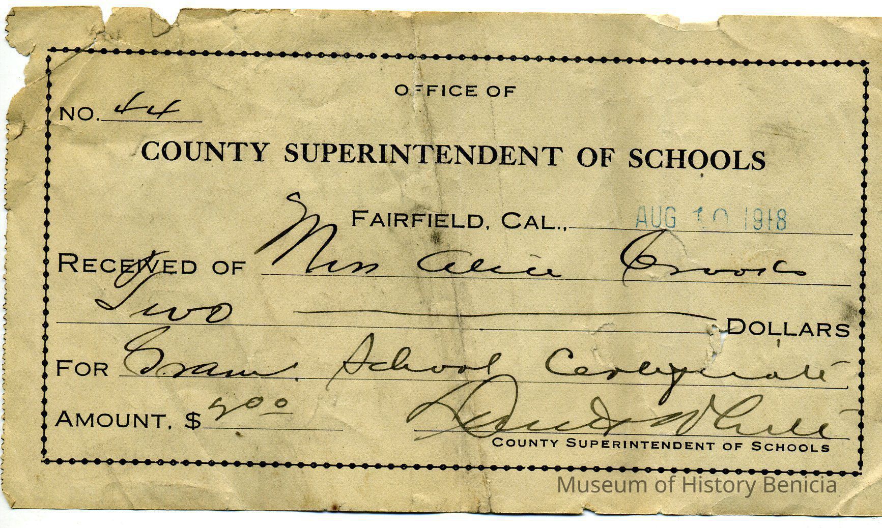 Receipt from the County Superintendent of Schools