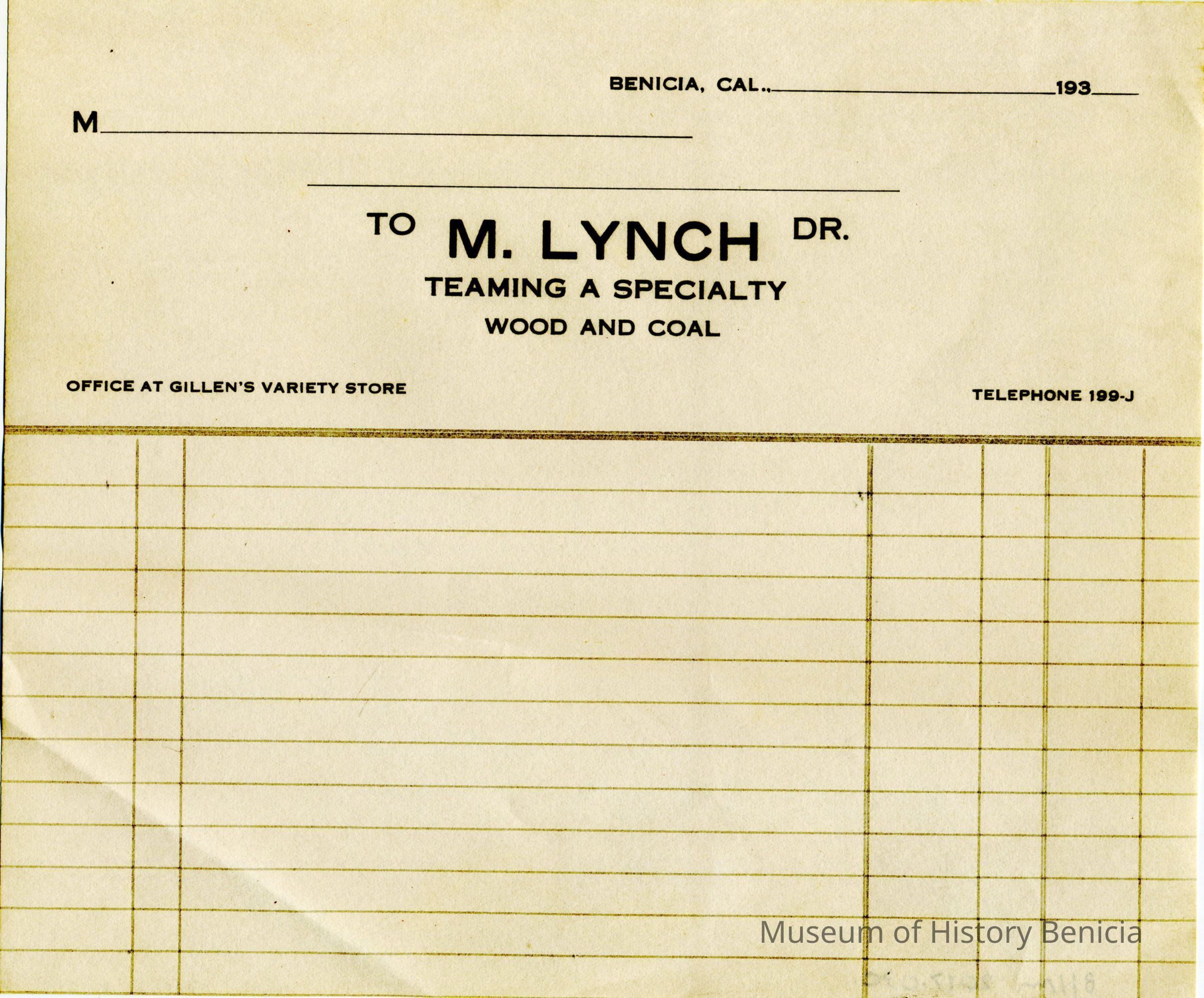 This is a blank receipt for M. Lynch who was a "teaming specialist". He transported wood and coal.