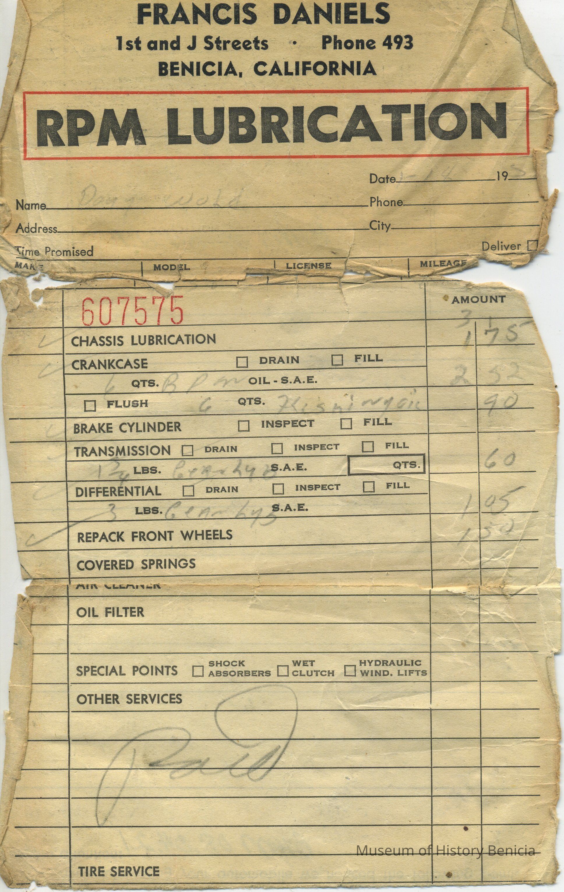 Receipt from Francis Daniels [Chevron Station] at First and J Streets / Phone 493 / Benicia, California