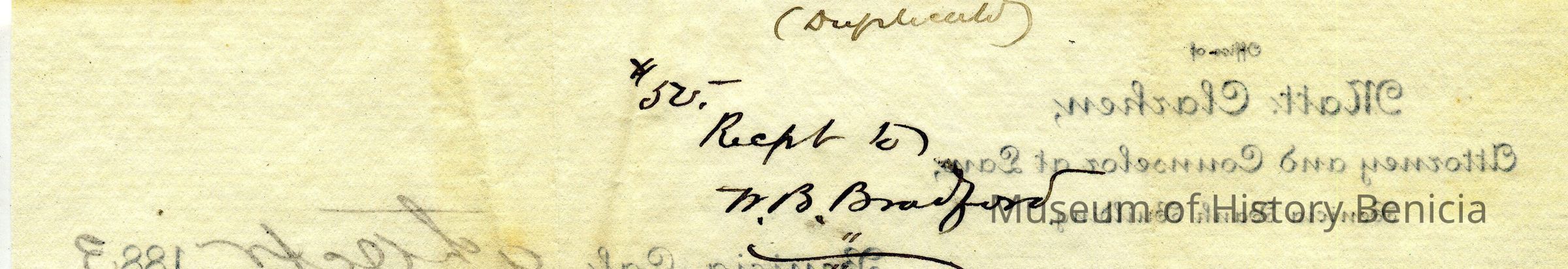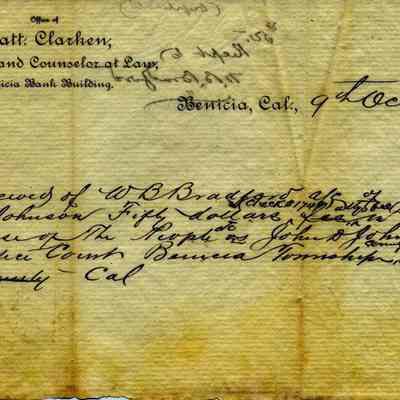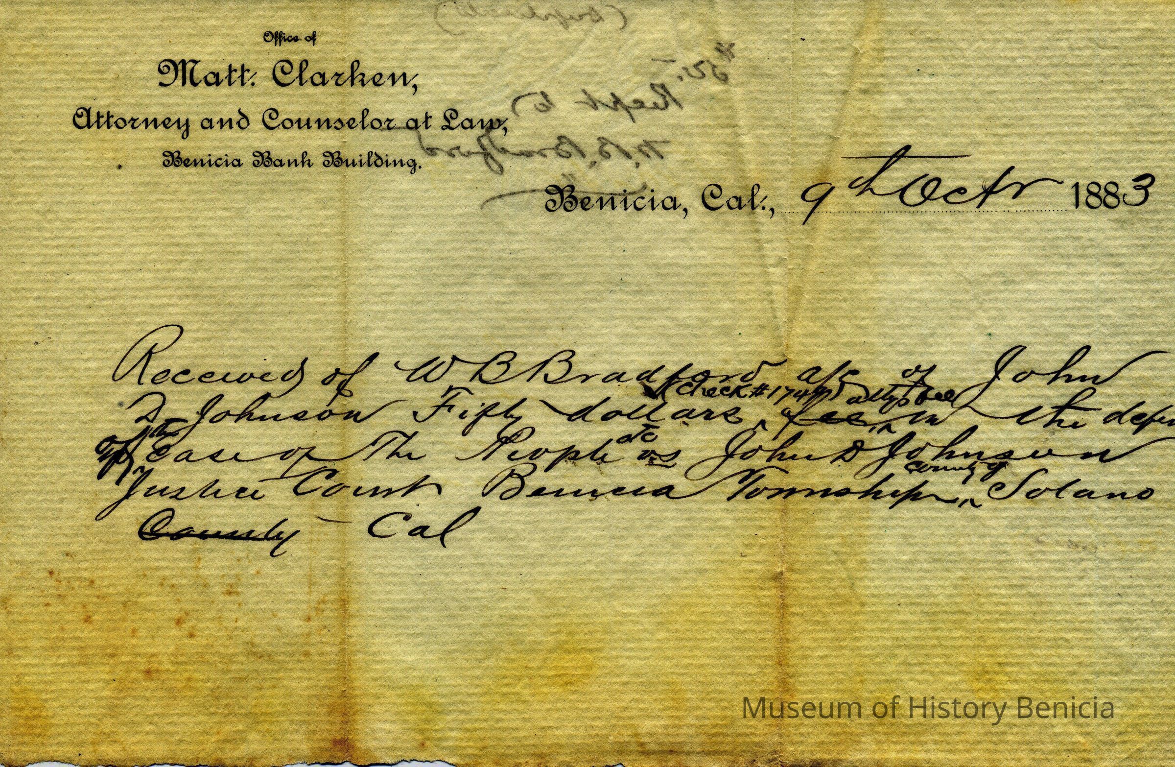 A receipt from Matt Clarken to W. B. Bradford for receipt of $50. The payment was for Mr. Clarken's defense of Mr. Bradford in a case of the People vs John D Johnson in the Justice Court of Benicia Township, Solano County. The receipt is dated Oct. 9, 1883.