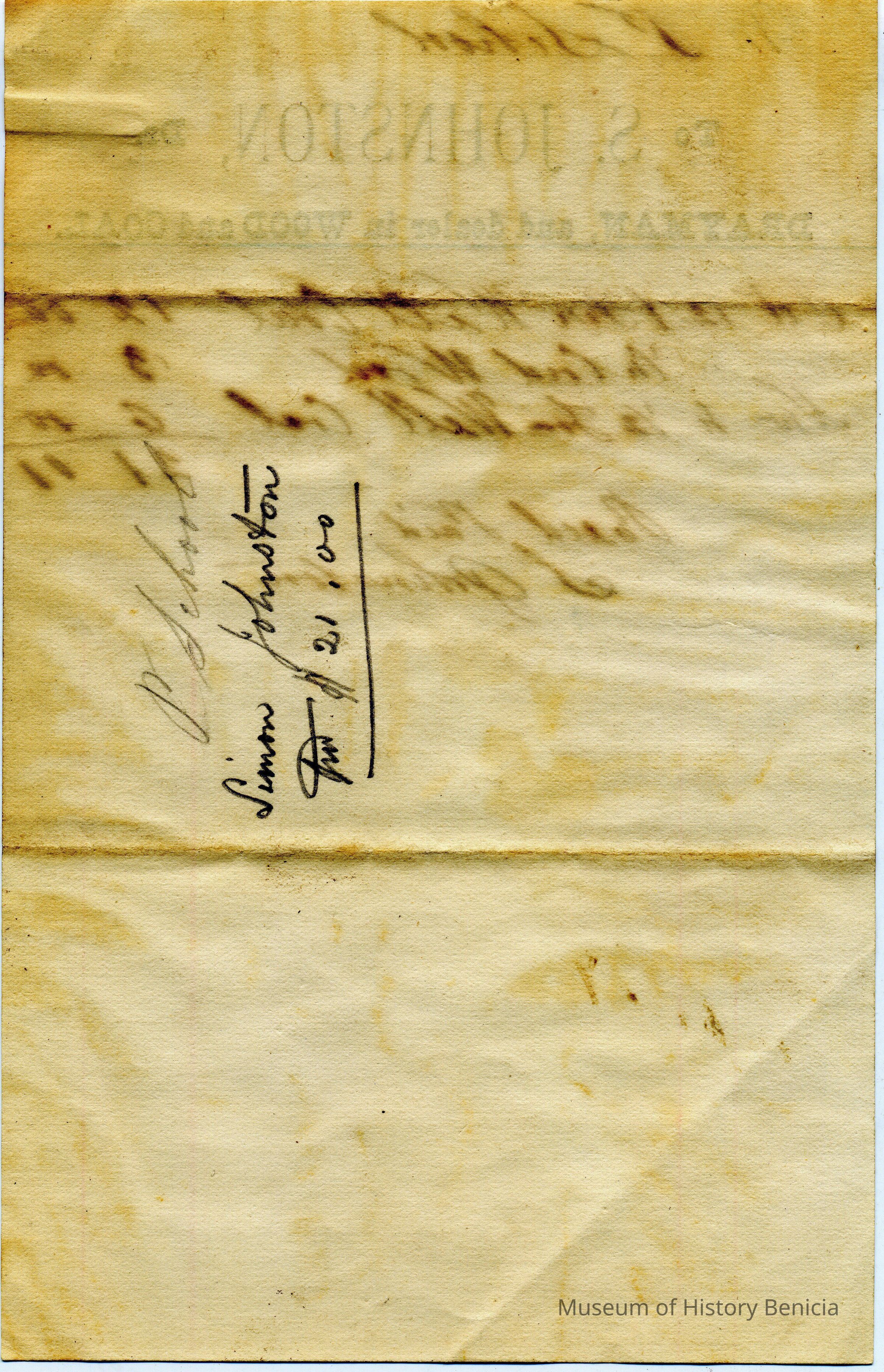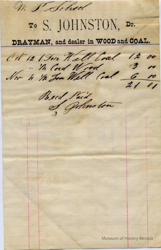 A receipt for $21.00 from "P School" to Simon Johnston, drayman, for delivery of coal and wood. There is no date on the receipt. The designation "P School" could refer to the public schools.Collection