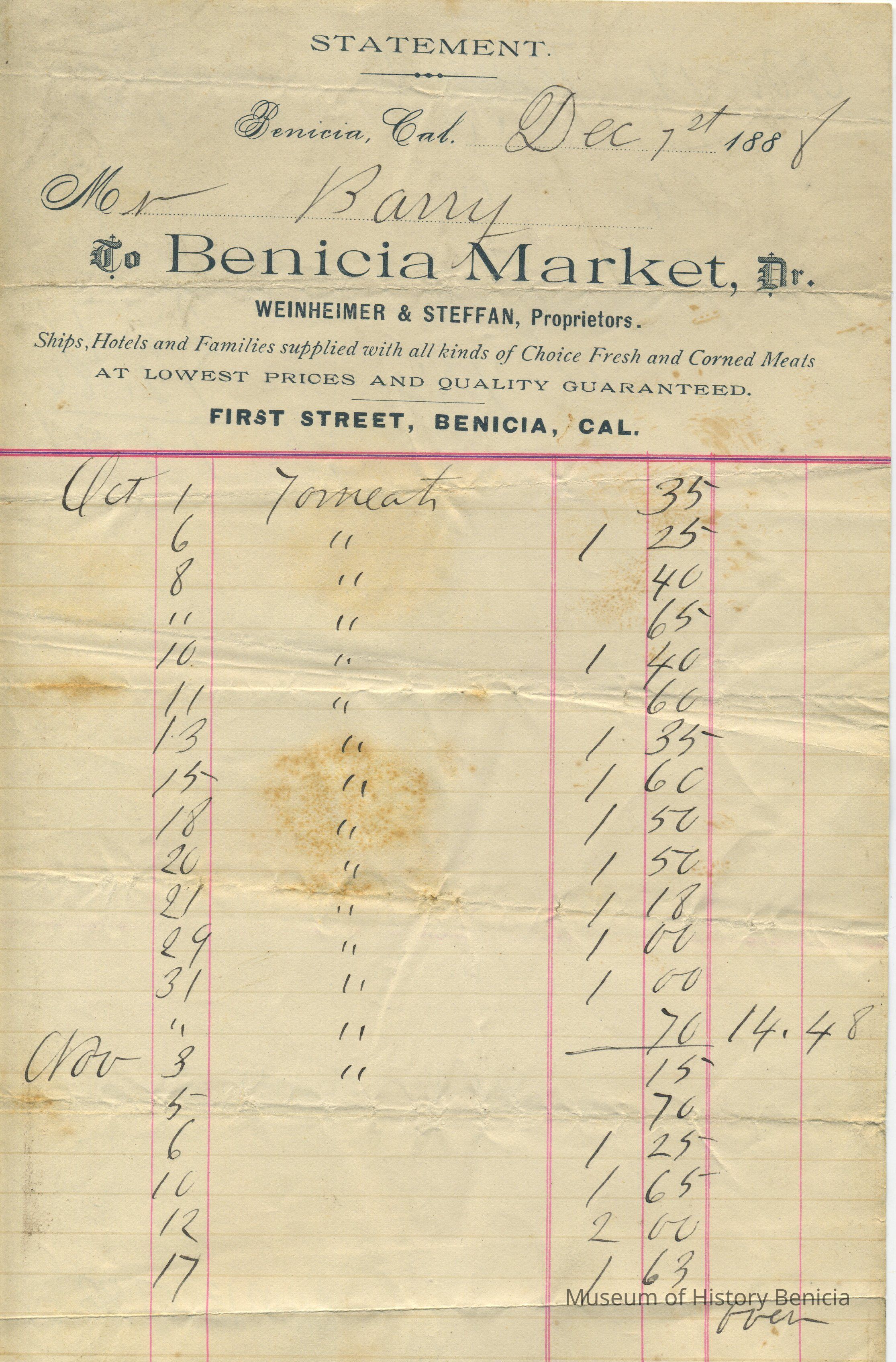 Business: Benicia Market, Weinheimer & Steffan, Proprietors. / Ships, Hotels and Families supplied with all kinds of Choice Fresh and Corned Meats / at lowest prices and quality guaranteed. First Street, Benicia.