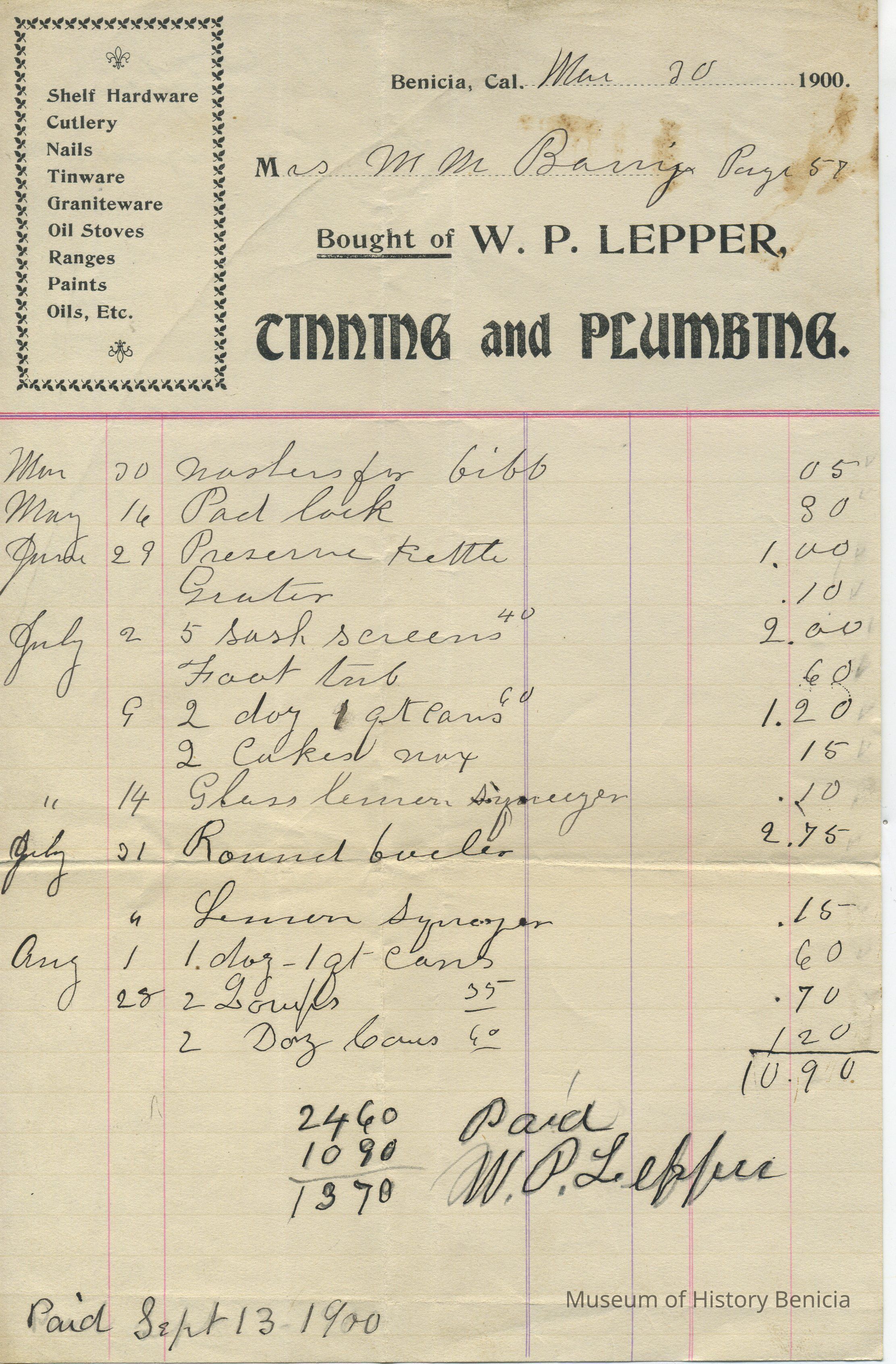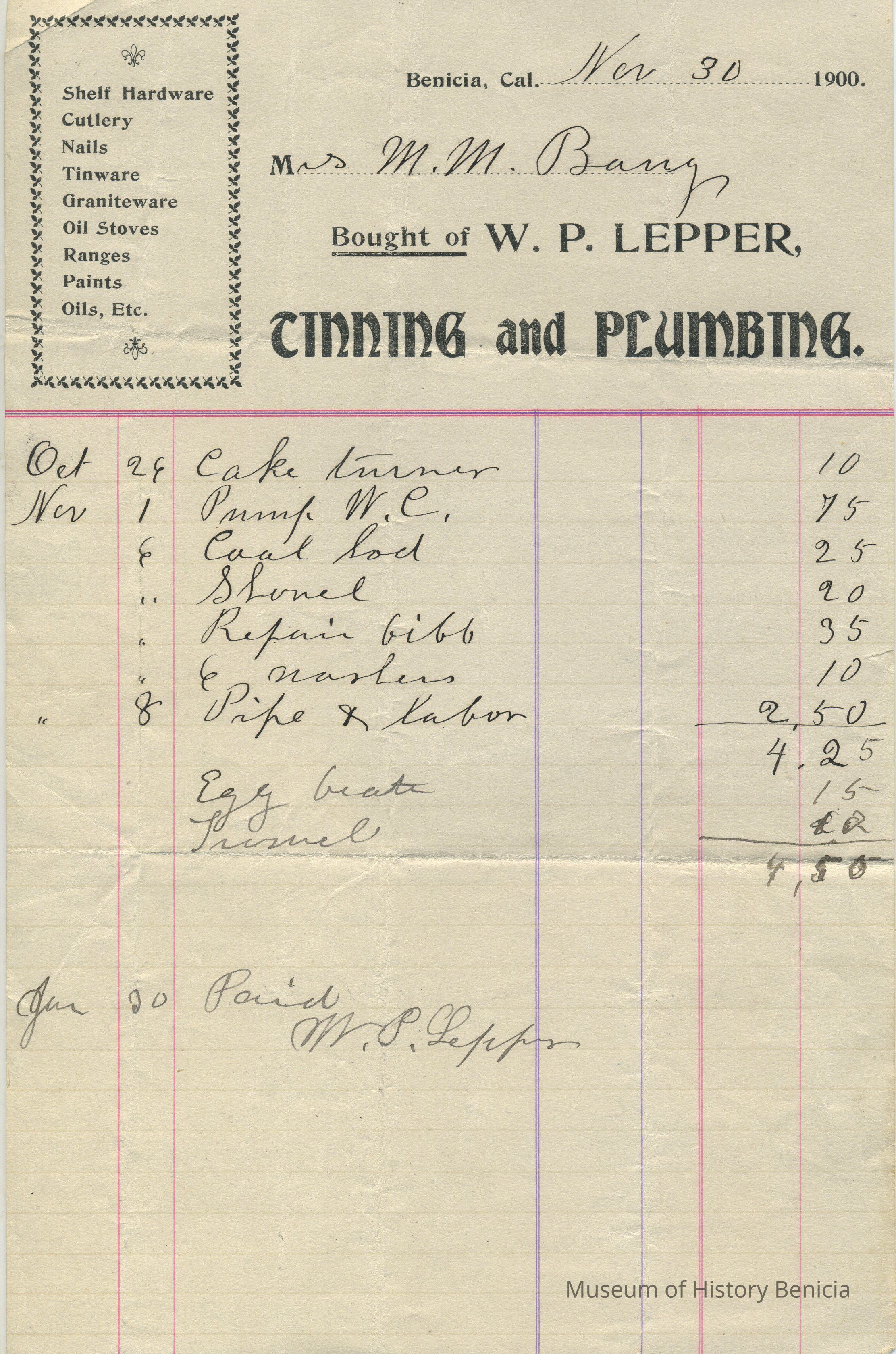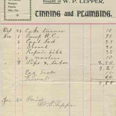 Business: W. P. Lepper, Tinning and Plumbing (Shelf Hardware, Cutlery, Nails, Tinware, Graniteware, Oil Stoves, Ranges, Paints, Oils, etc.)