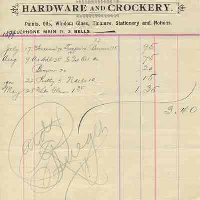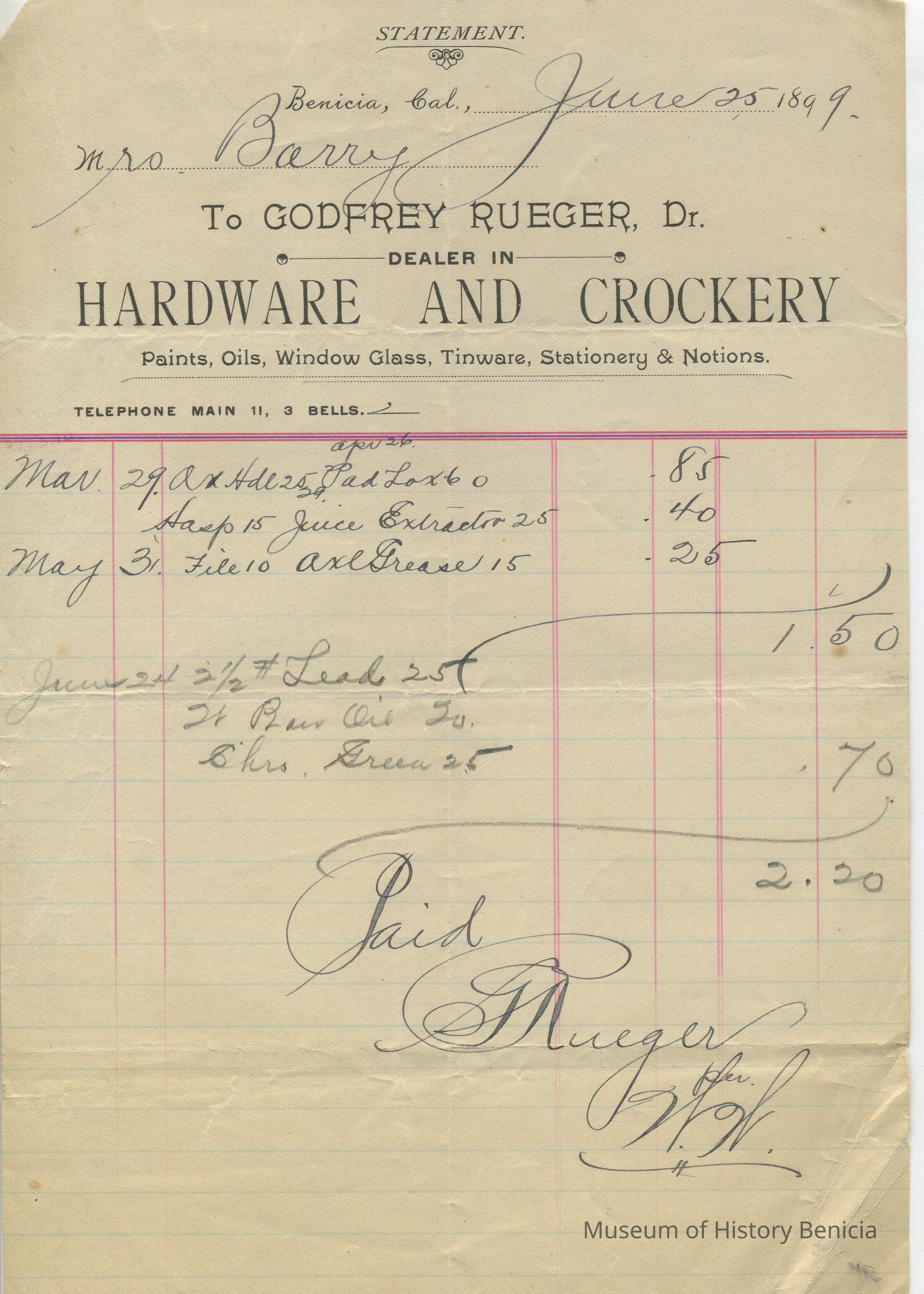 Customer: Mrs. Barry - three handwritten 5-1/2" x 8-1/2" receipts dated June 25, 1899, Sept. 1, 1900 and Jan. 10, 1901. Items are listed by dates of purchase.Collection