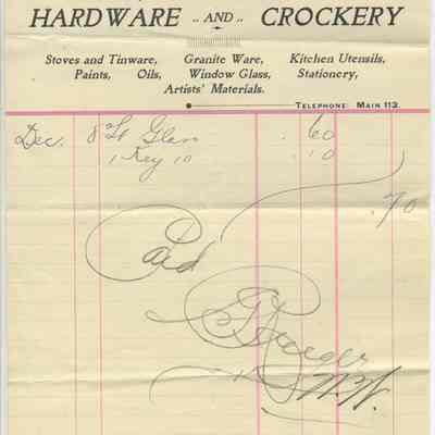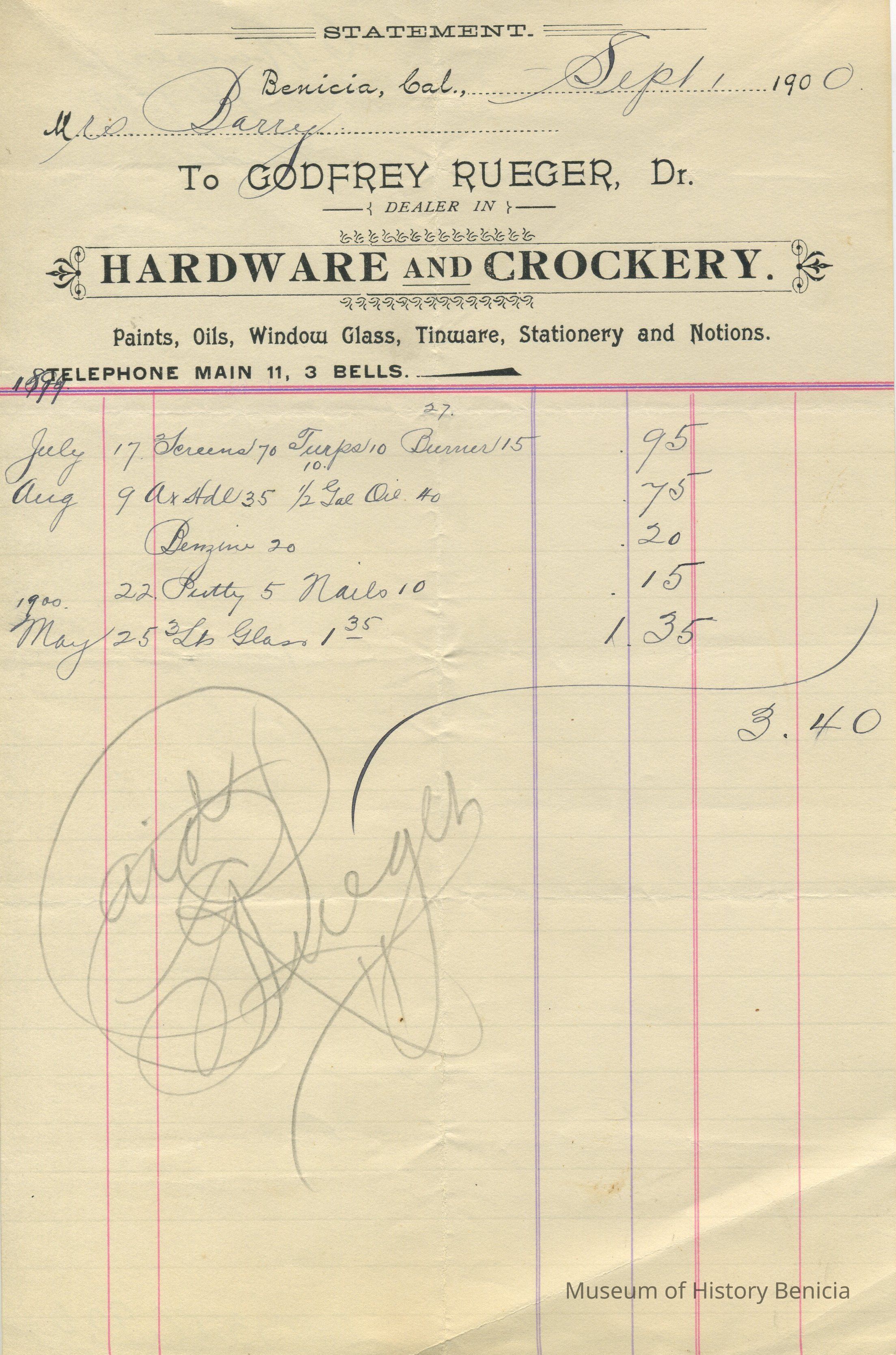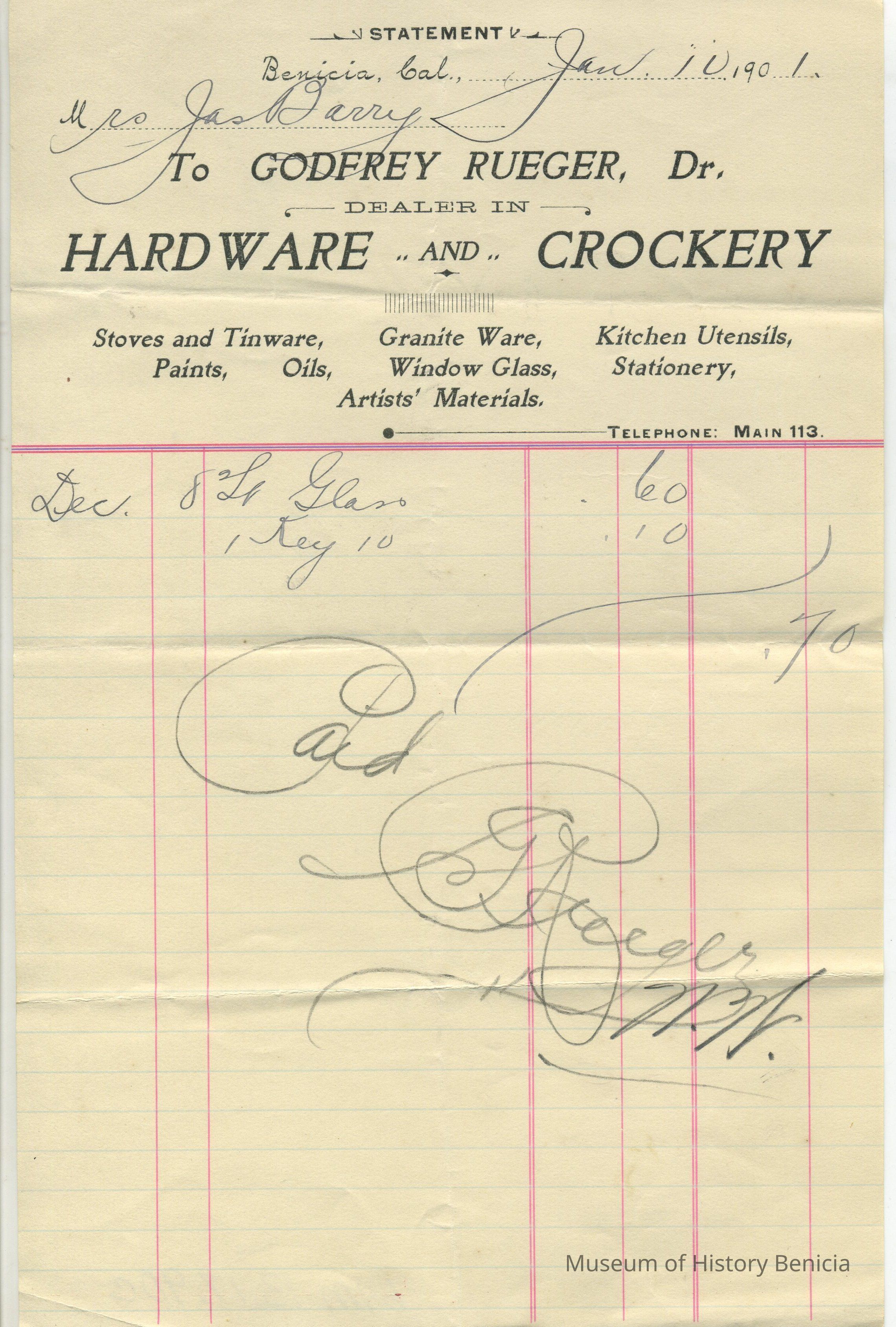 Business: Godfrey Rueger, Dealer in Hardware and Crockery / paints, oils, window glass, tinware, stationery & notions. The third receipt lists: stoves and tinware, graniteware, kitchen utensils, paints, oils, window glass, stationery, artists' materials.