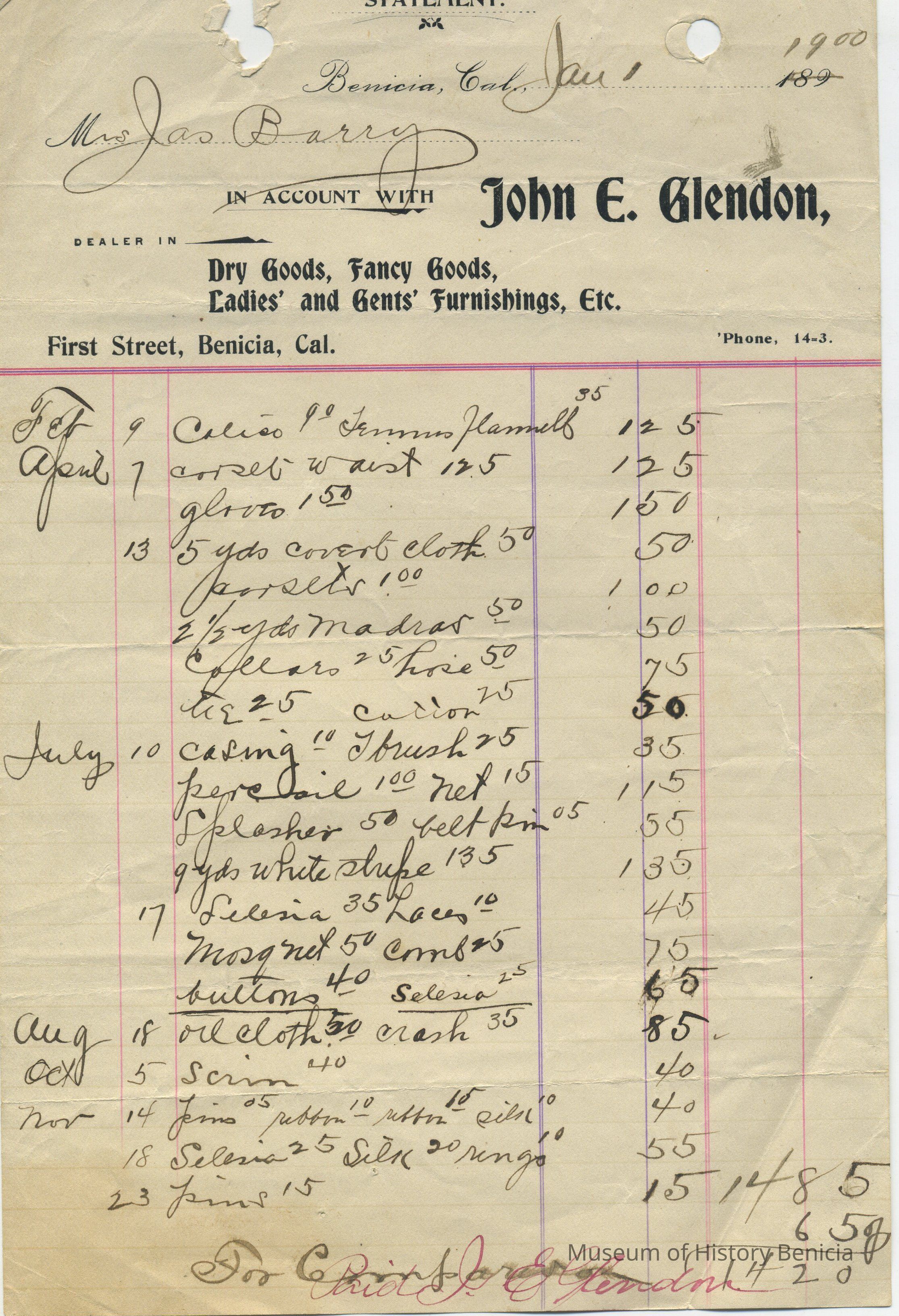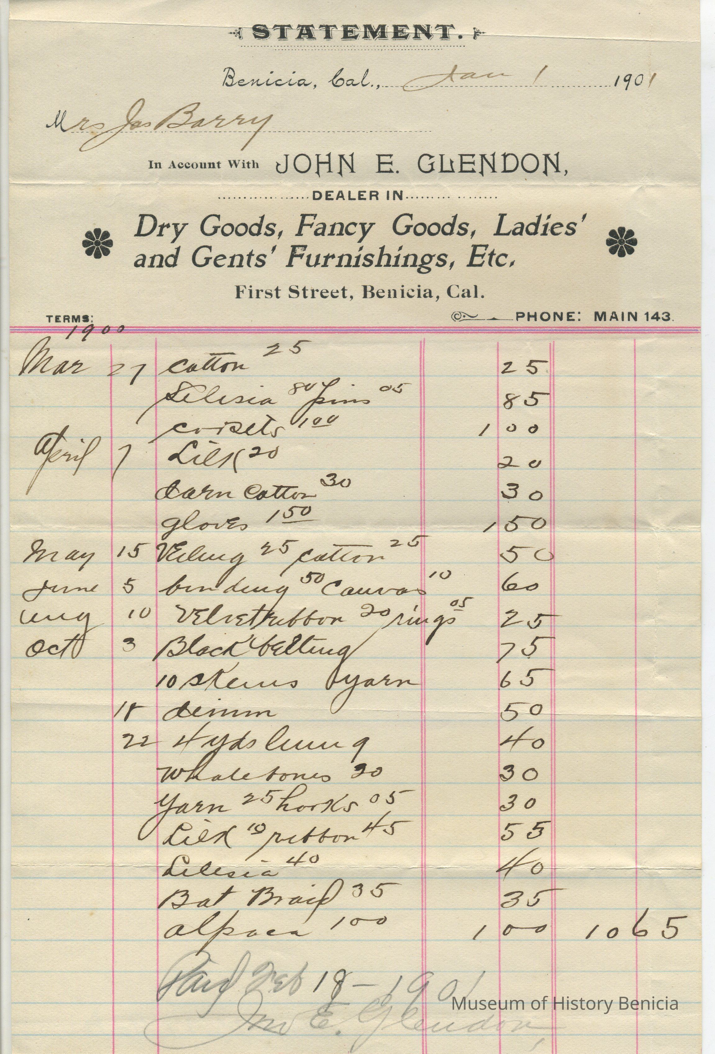 Business: John E. Glendon, dealer in Dry Goods, Fancy Goods, Ladies' and Gents' Furnishings, etc. First Street, Benicia, Cal. 'Phone 14-3