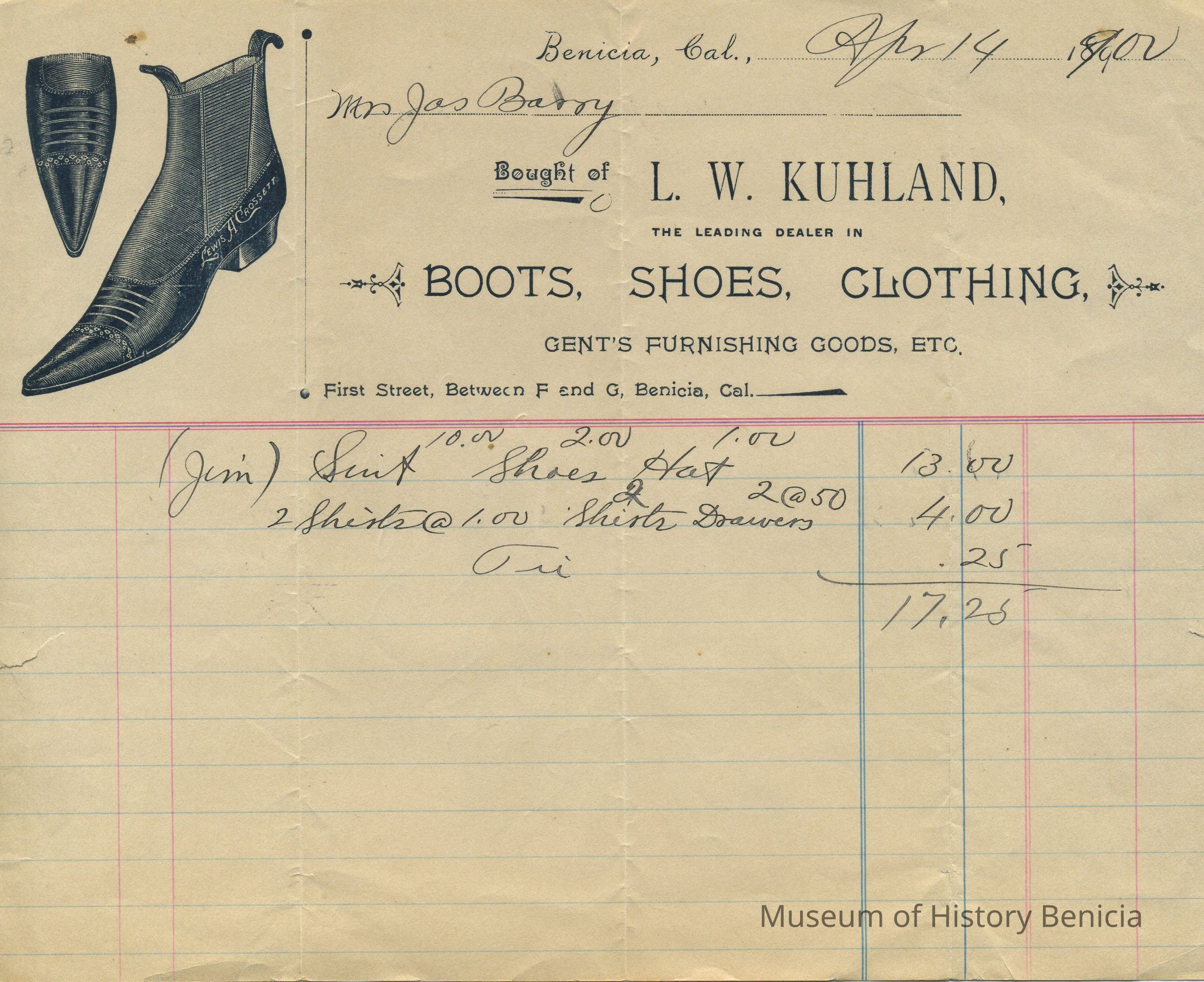 Business: L. W. Kuhland, The leading dealer in Boots, Shoes, Clothing; Gent's Furnishing Goods, etc.; First Street between F and G, Benicia, Cal.