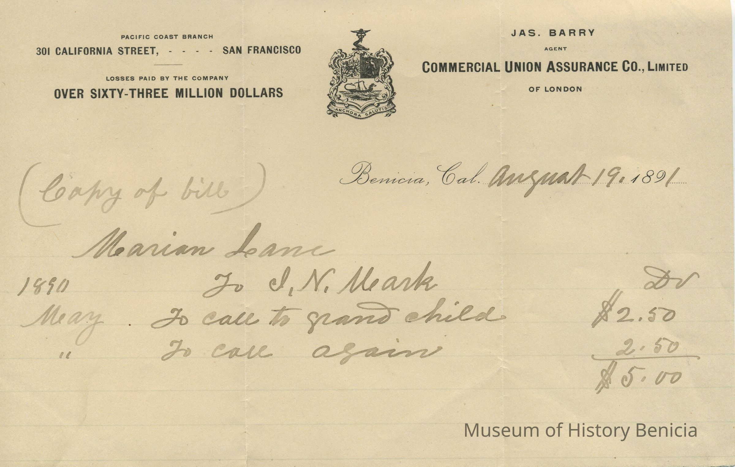 Business: Jas. Barry, Commercial Union Assurance Co. Limited of London, Pacific Coast Branch 301 California St. ... San Francisco / Losses paid by the company over sixty three million dollars