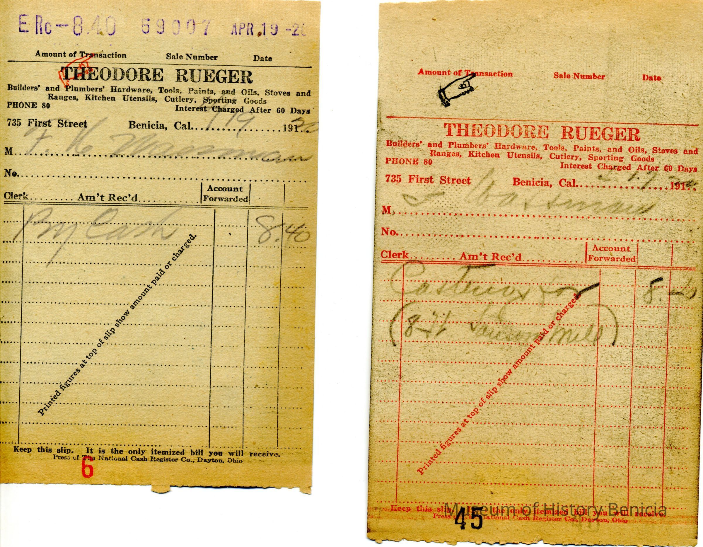 This is a receipt from Theodore Rueger the owner of a hardware store in Benicia, to Frank Wassmann, plumber, for items bought on credit in 1920.Collection