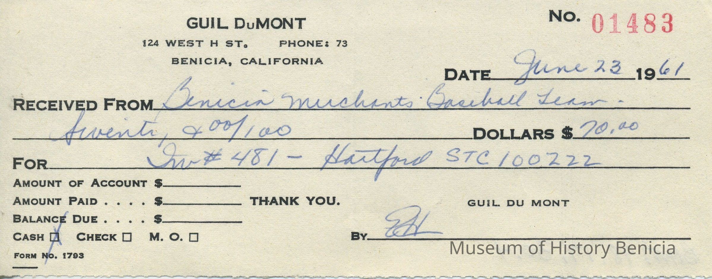 Receipt from Guil DuMont, insurance agent No. 01483