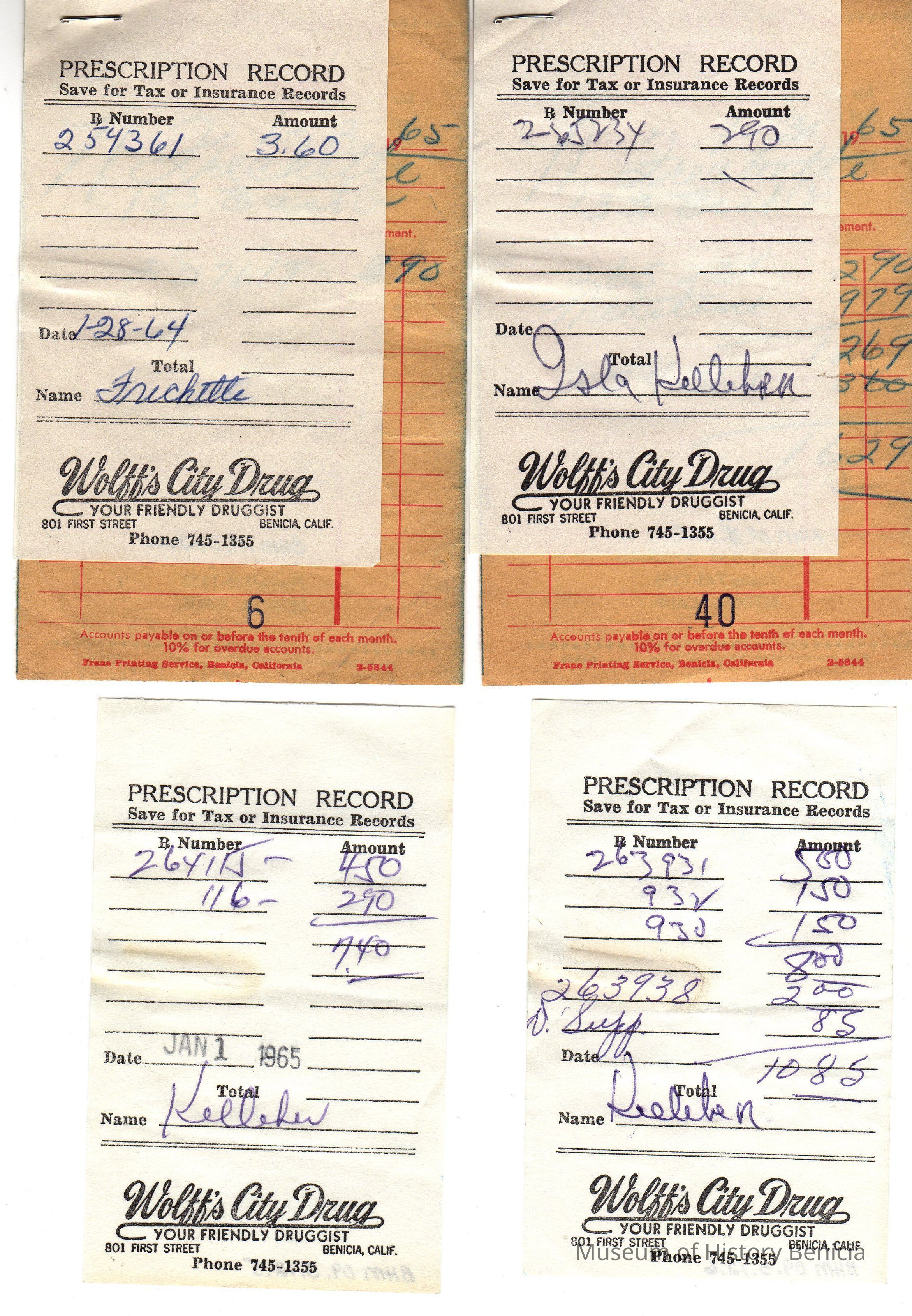 2009.3.12.2 - Yellow Receipt with Wolff's City Drug information at top, Date 1-2-65, Name