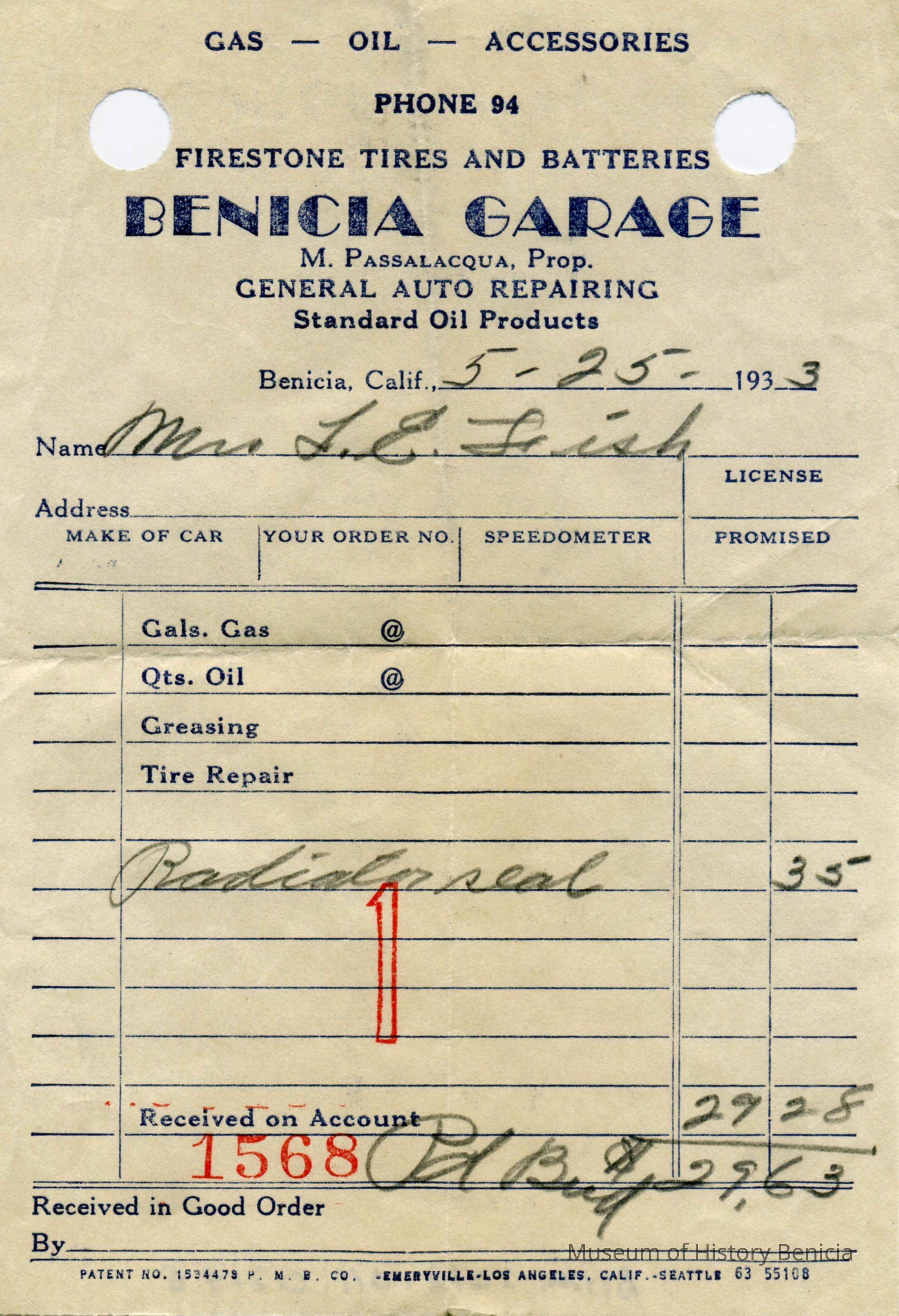 Receipt from Benicia Garage for auto services and supplies. Dated from 1930-1934. Made out to Mrs L Fish. Some dated 1932 and 1933 show M Passalacqua prop.Collection