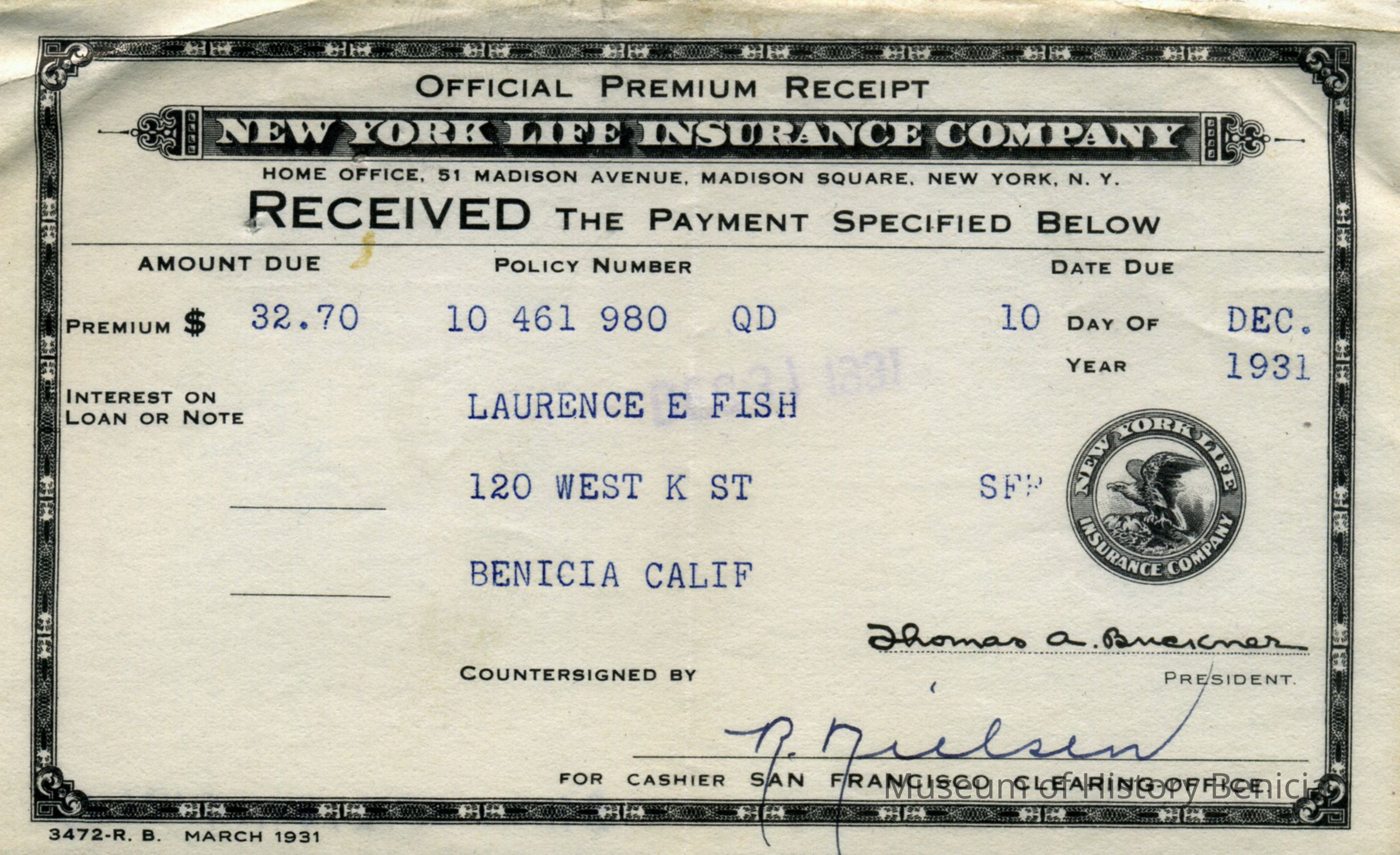 Receipts from New York Life Insurance Company from 05/23/1930 to 12/10/1934. Most are for payment of premiums and a few are for dividends paid at the end of a year. All are for Lawerence and Ardella Fish.Collection