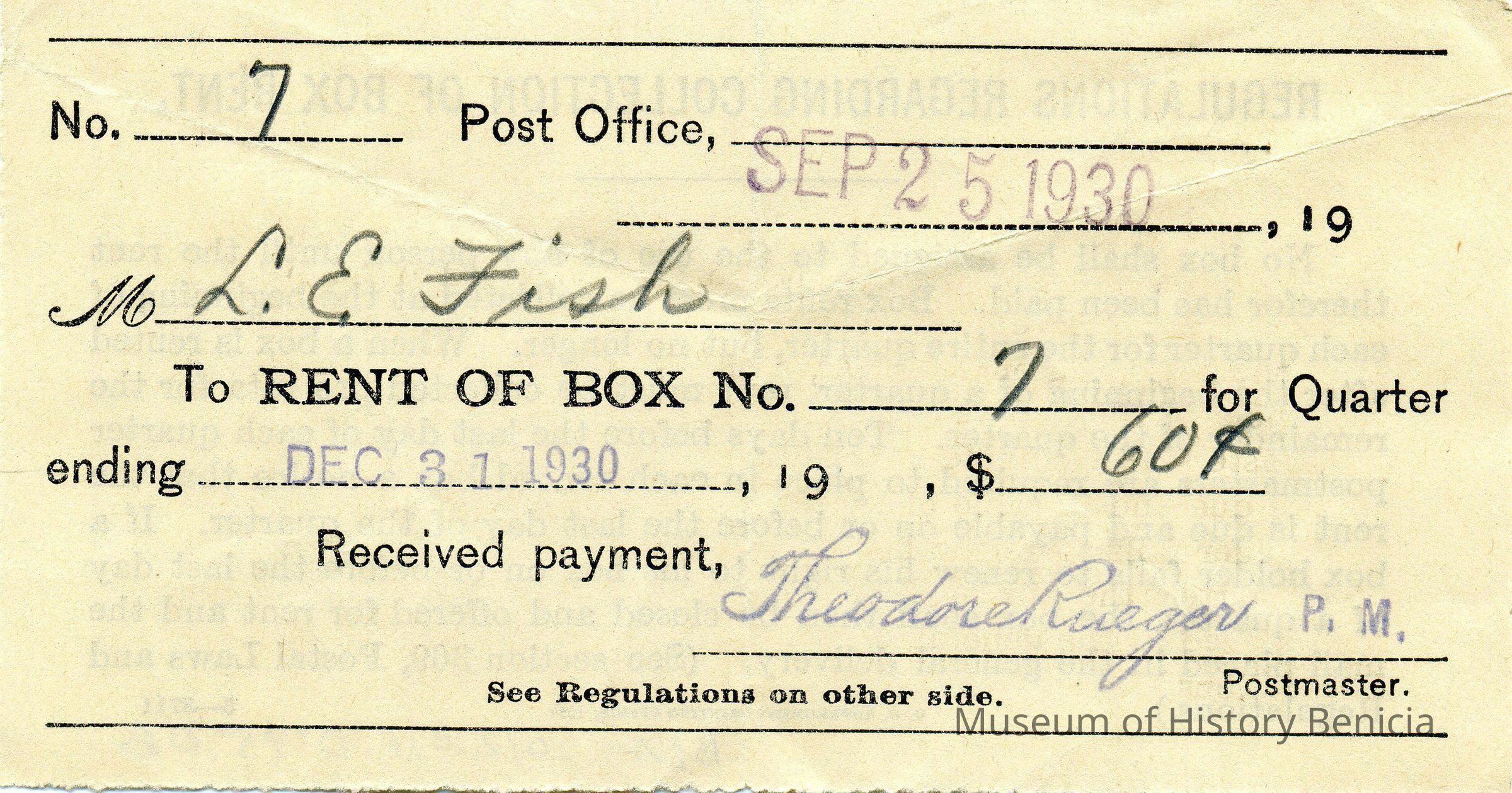 Receipts from Post Office Box rentals in Benicia by LE Fish for 1930-1933. All for box no. 7 and for $.60 per quarter.
