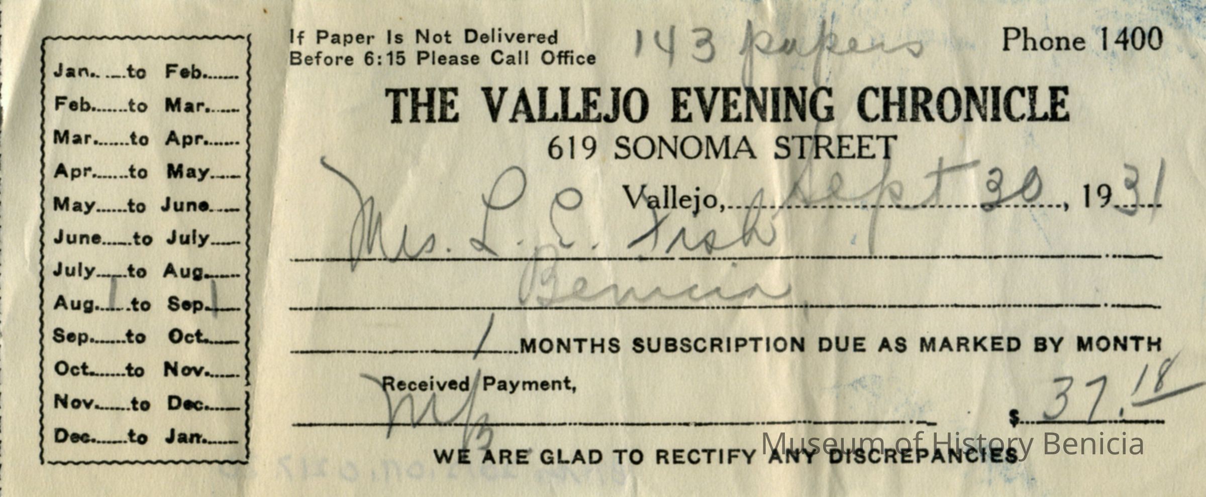Receipts from various area newspapers to Mrs LE Fish over a period from 1929 to 1934 (one card is from June 1927 and is from the SF Bulletin circulation dept.). Newspapers include: