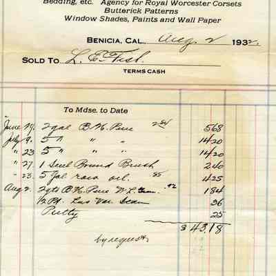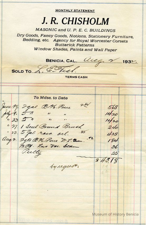 Receipts for Mr & Mrs L.E. Fish from J.R. Chisholm company. They were in the Masonic and U.P.E.C. Buildings in Benicia. The receipts are from 1932 - 1933. The company sold dry goods, window shades, paint, etc.Collection