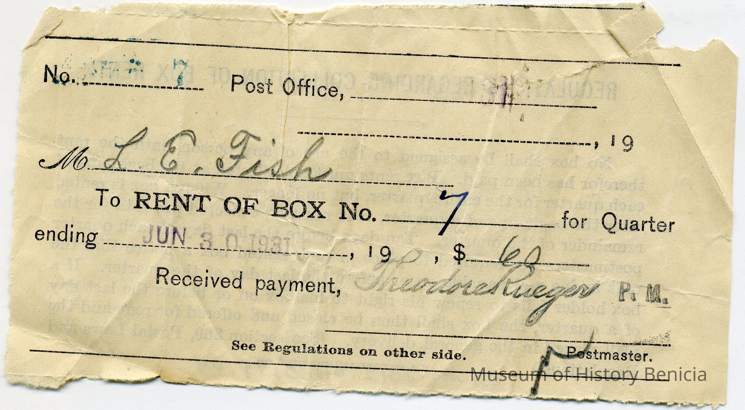 Receipts from Post Office Box rentals in Benicia by LE Fish for 1930-1933. All for box no. 7 and for $.60 per quarter.