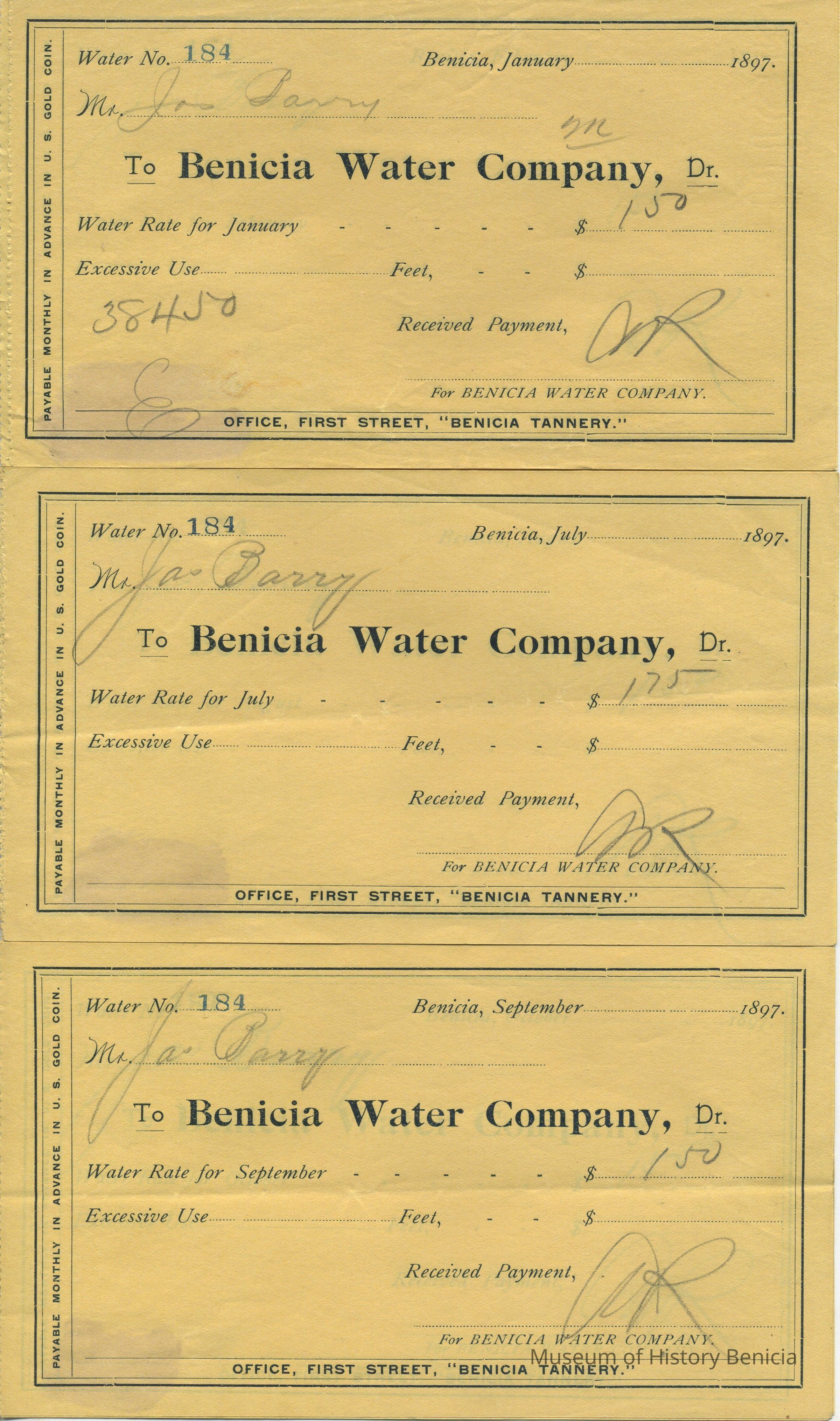 Receipts - Ten receipts From Benicia Water Company for customer Jas. Barry; water no.184 in the year 1897;