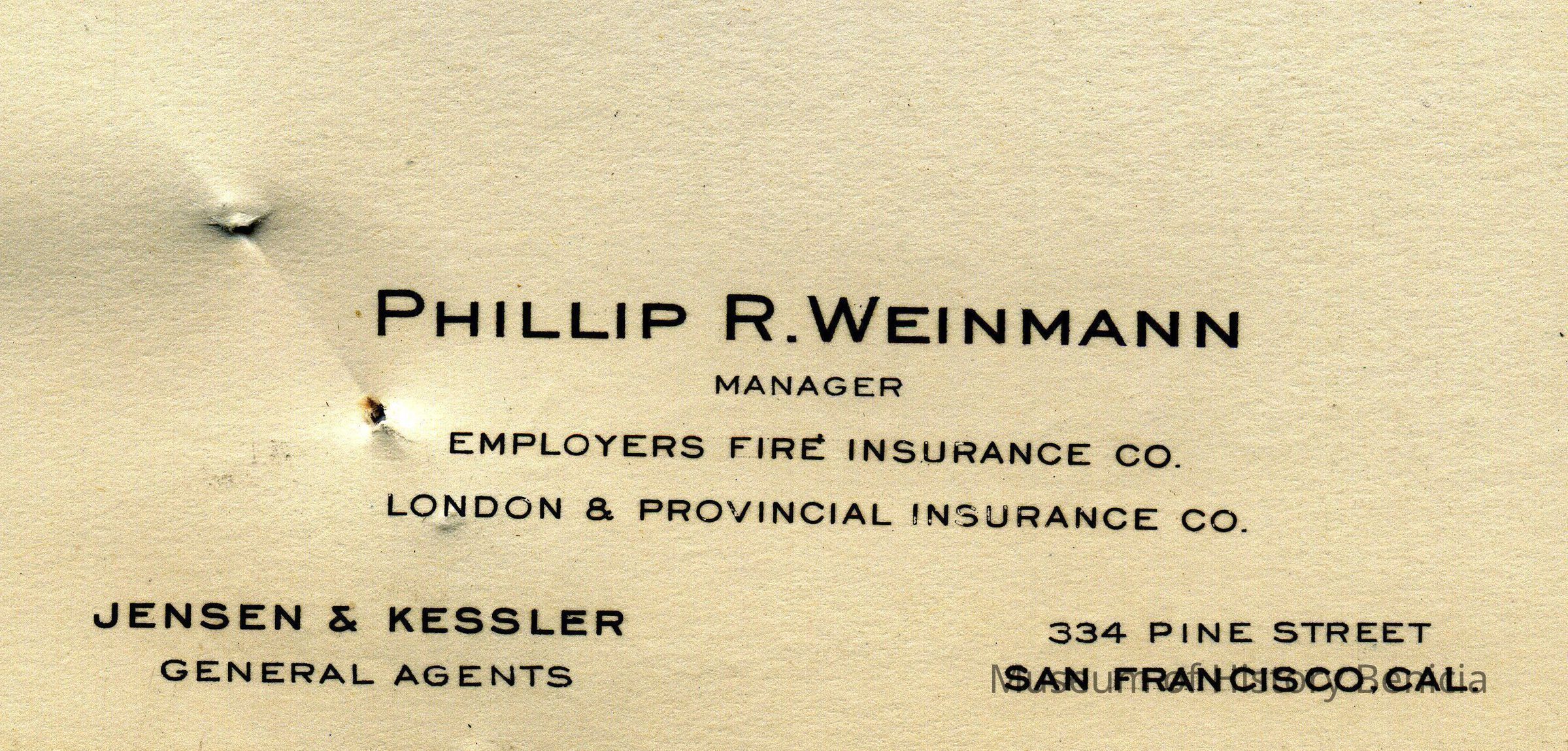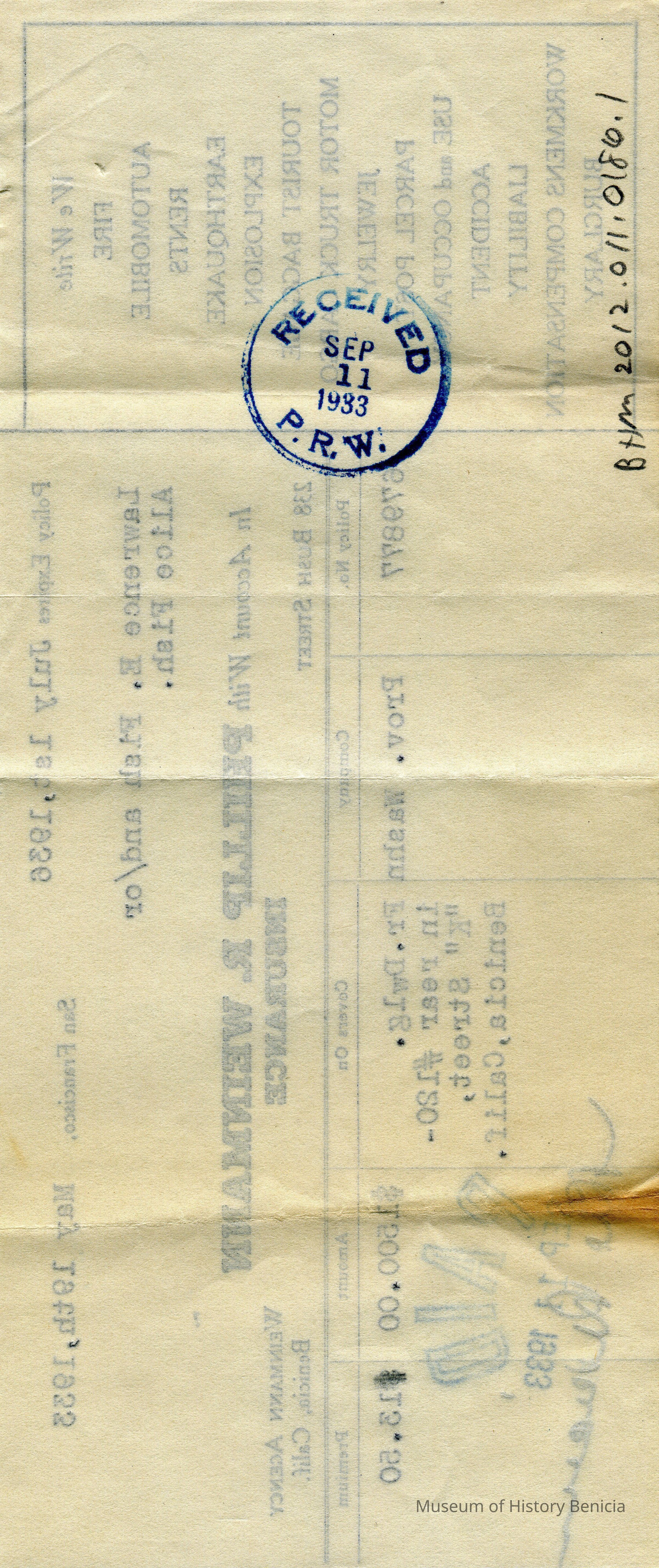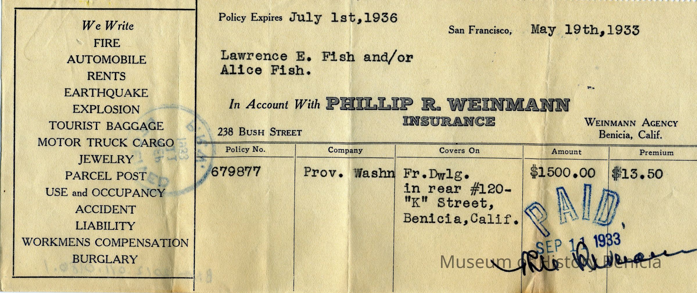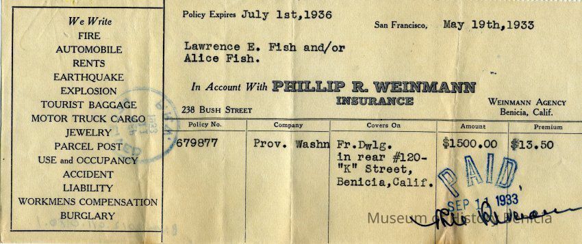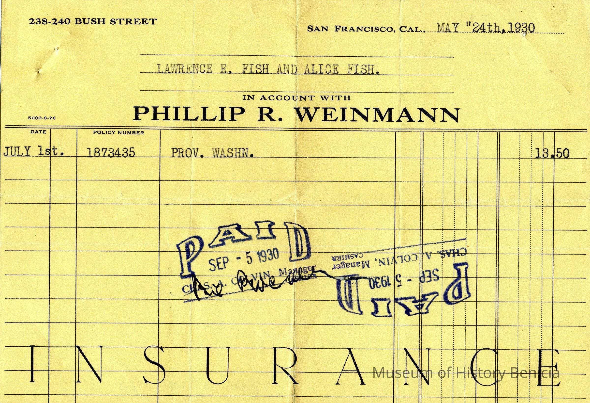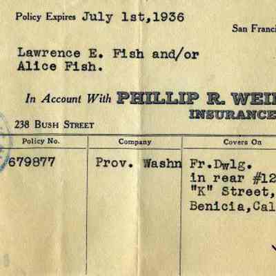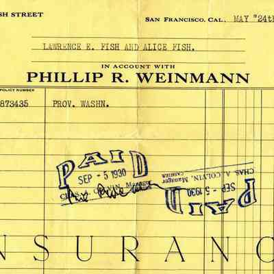 Receipts for Mr & Mrs L.E. Fish from the Phillip R Weinmann Insurance Co of San Francisco. One is dated 05/19/1933 and the other 05/24/1930.Collection