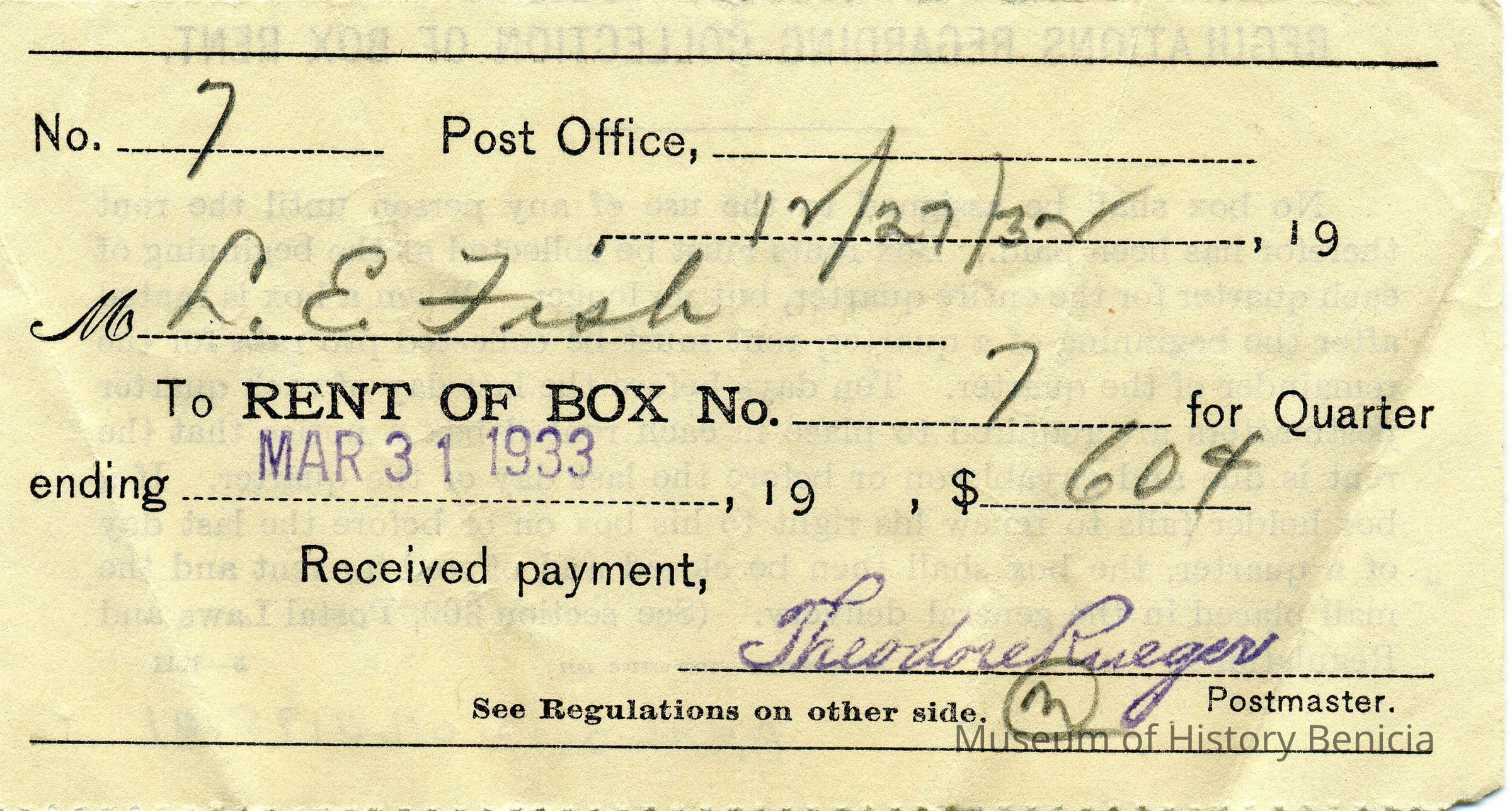 Receipts from Post Office Box rentals in Benicia by LE Fish for 1930-1933. All for box no. 7 and for $.60 per quarter.