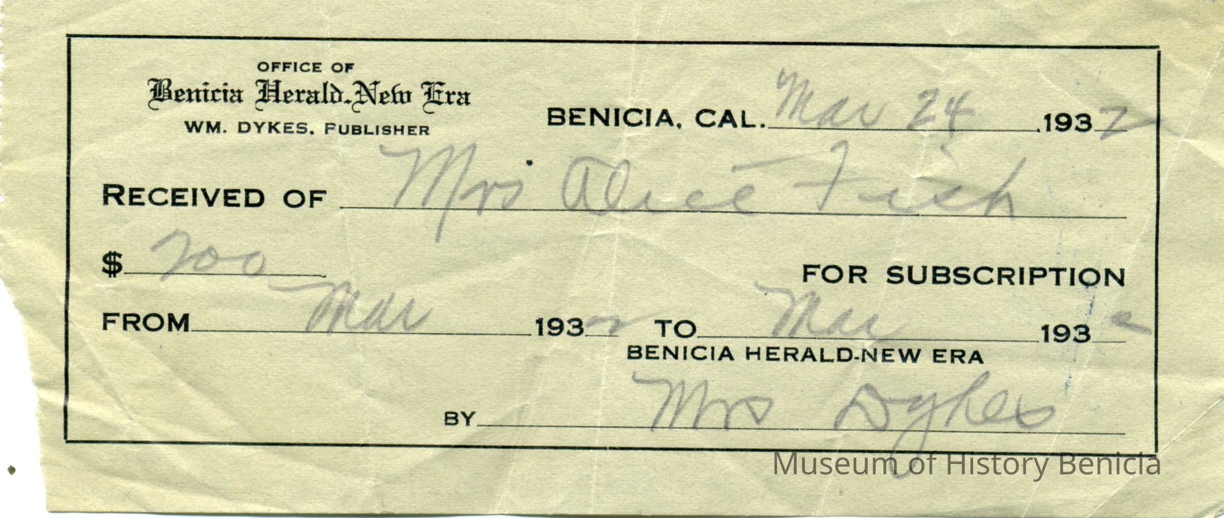 Receipts from various area newspapers to Mrs LE Fish over a period from 1929 to 1934 (one card is from June 1927 and is from the SF Bulletin circulation dept.). Newspapers include: