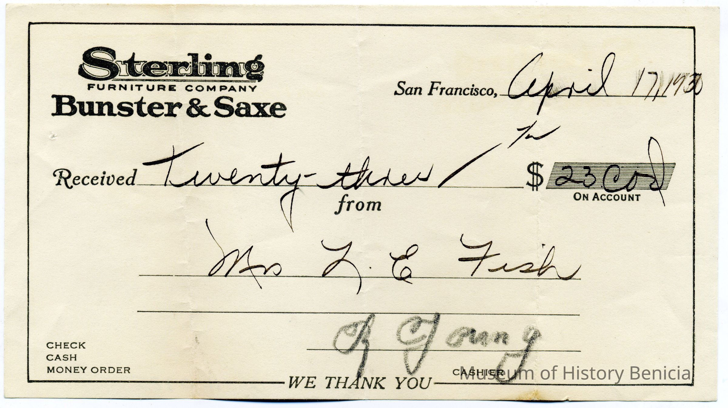 Receipts for Mrs L.E. Fish from the Sterling Bunster & Saxe furniture Co in San Francisco. One is dated 04/17/1930 and the other 10/17/1933.Collection