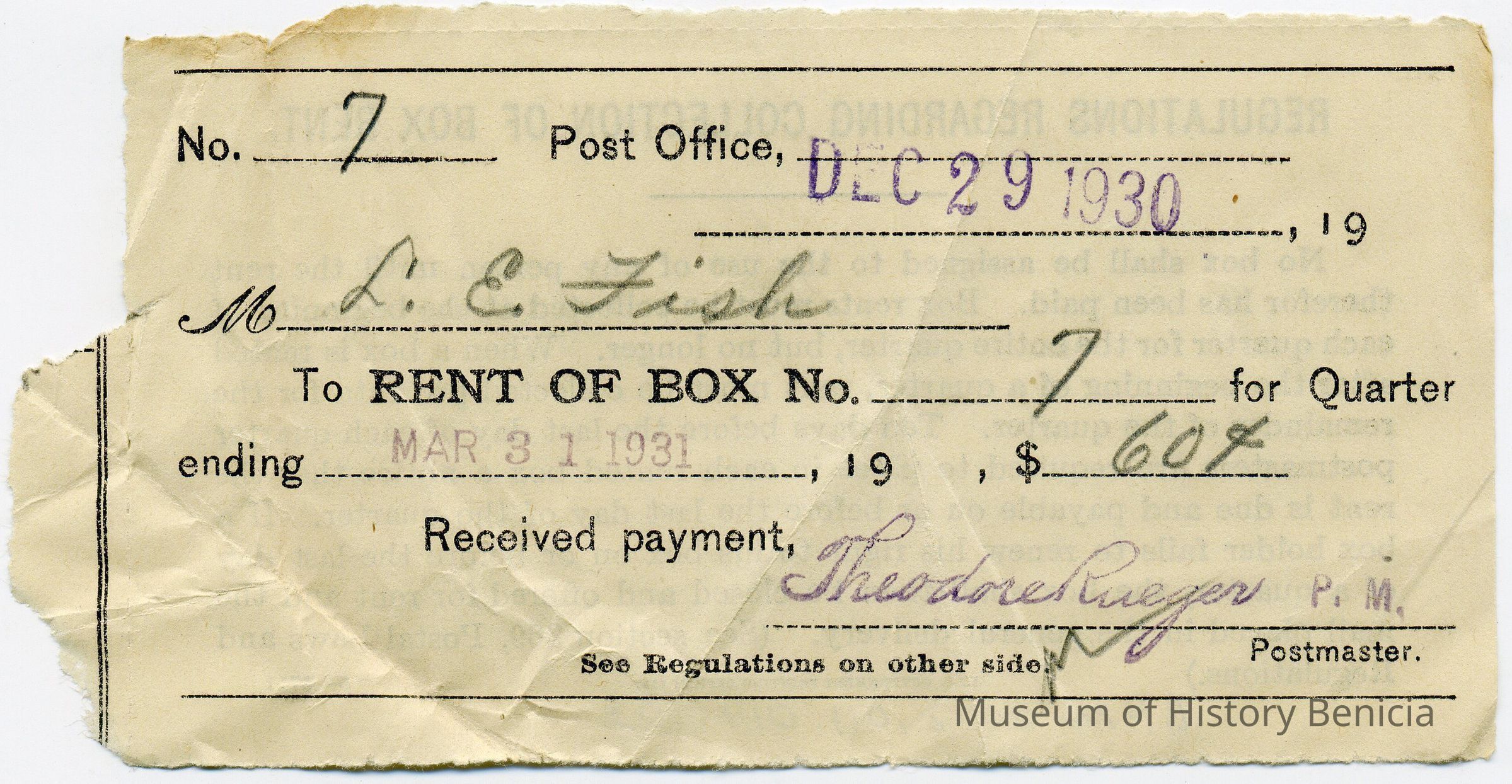 Receipts from Post Office Box rentals in Benicia by LE Fish for 1930-1933. All for box no. 7 and for $.60 per quarter.