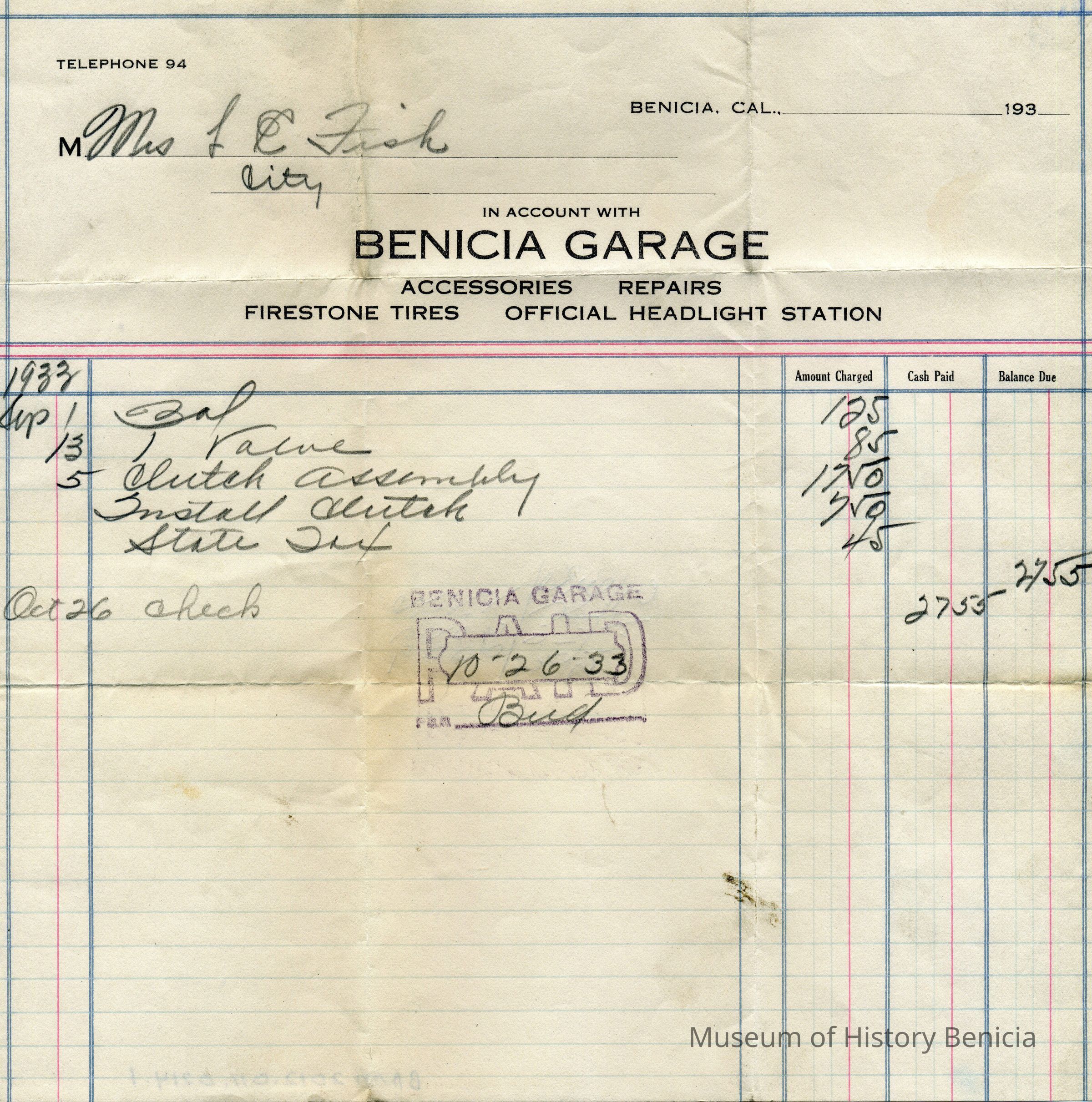 Receipt from Benicia Garage for auto services and supplies. Dated from 1930-1934. Made out to Mrs L Fish. Some dated 1932 and 1933 show M Passalacqua prop.Collection