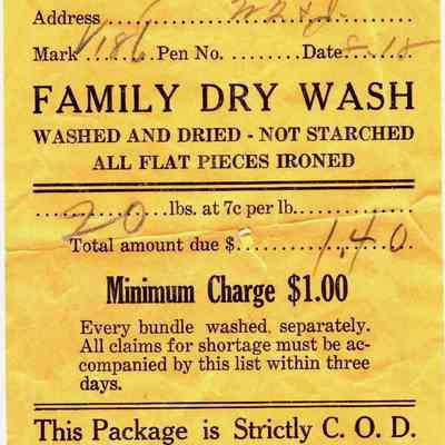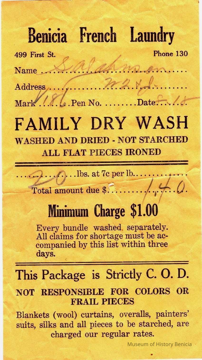 Receipt from "Benicia French Laundry" dated 1918. It is for 20 Lbs of laundry at $.07 per pound or $1.40. The name on the receipt is SA Johnson.Collection