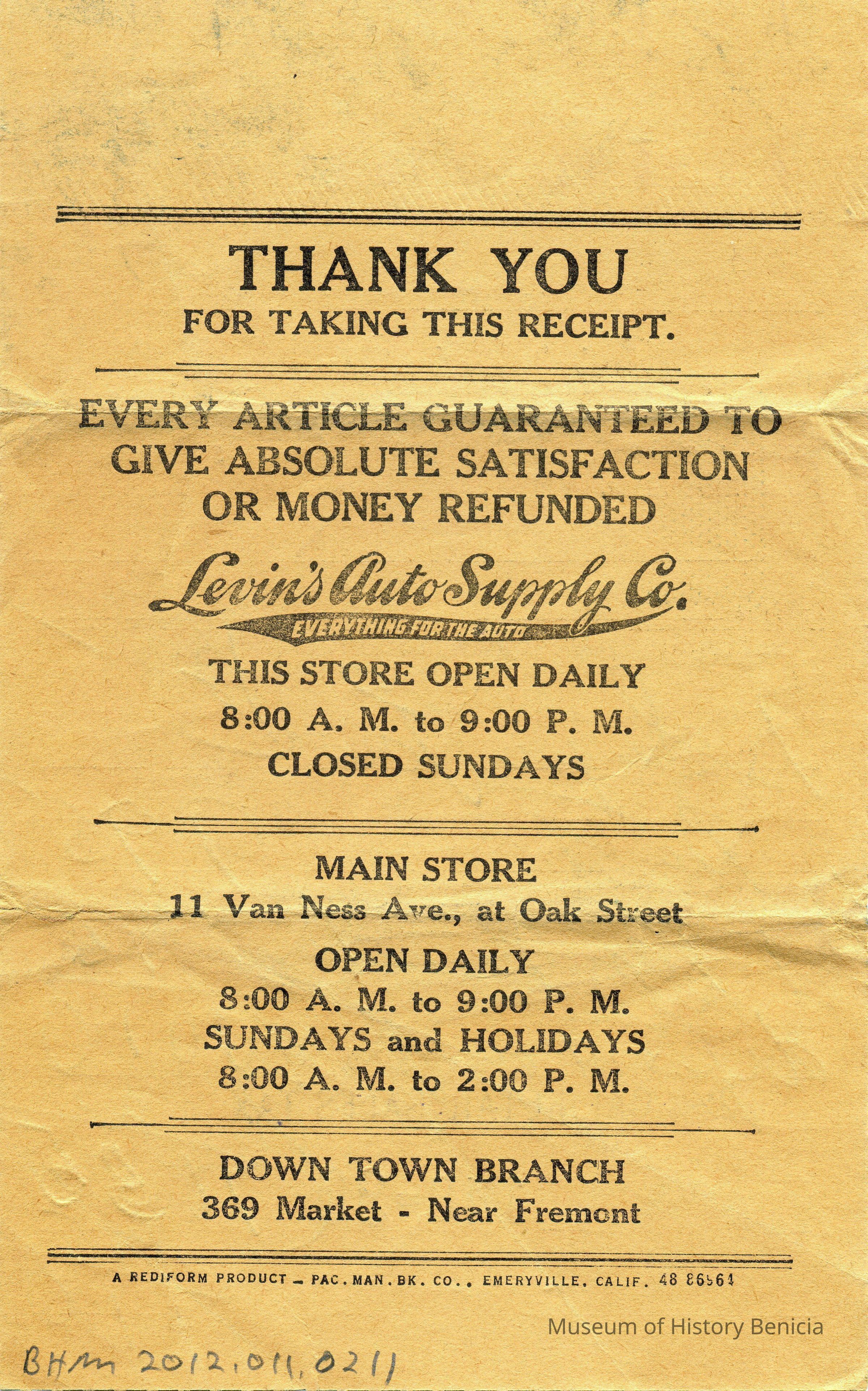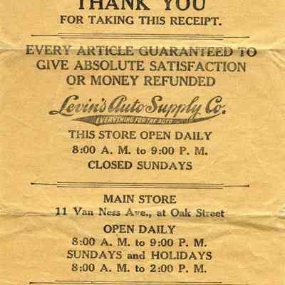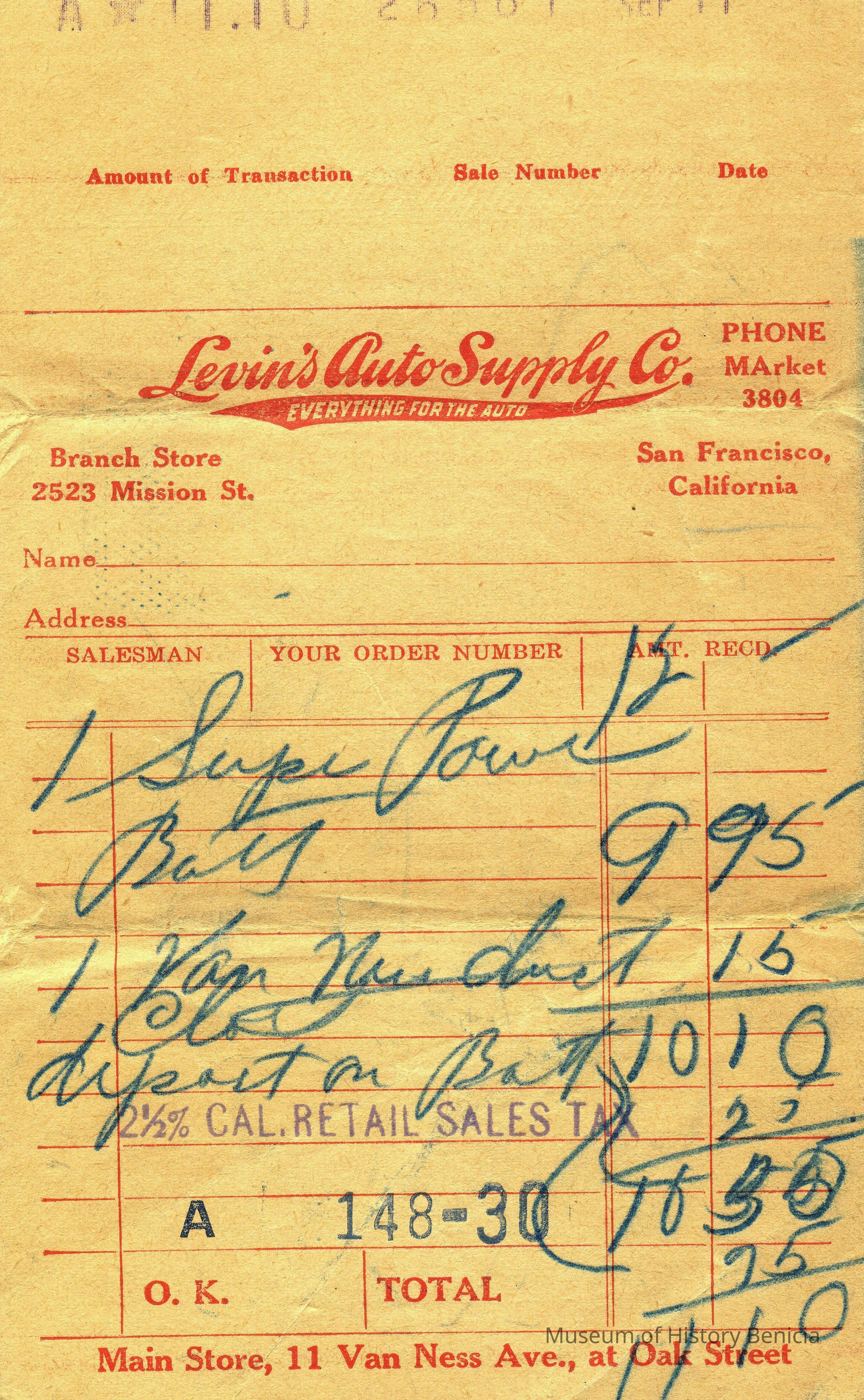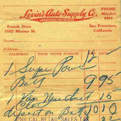 Receipt from Levin's Auto Supply Co (11 Van Ness Av, SF CA) for a battery and dust cloth. No Date.