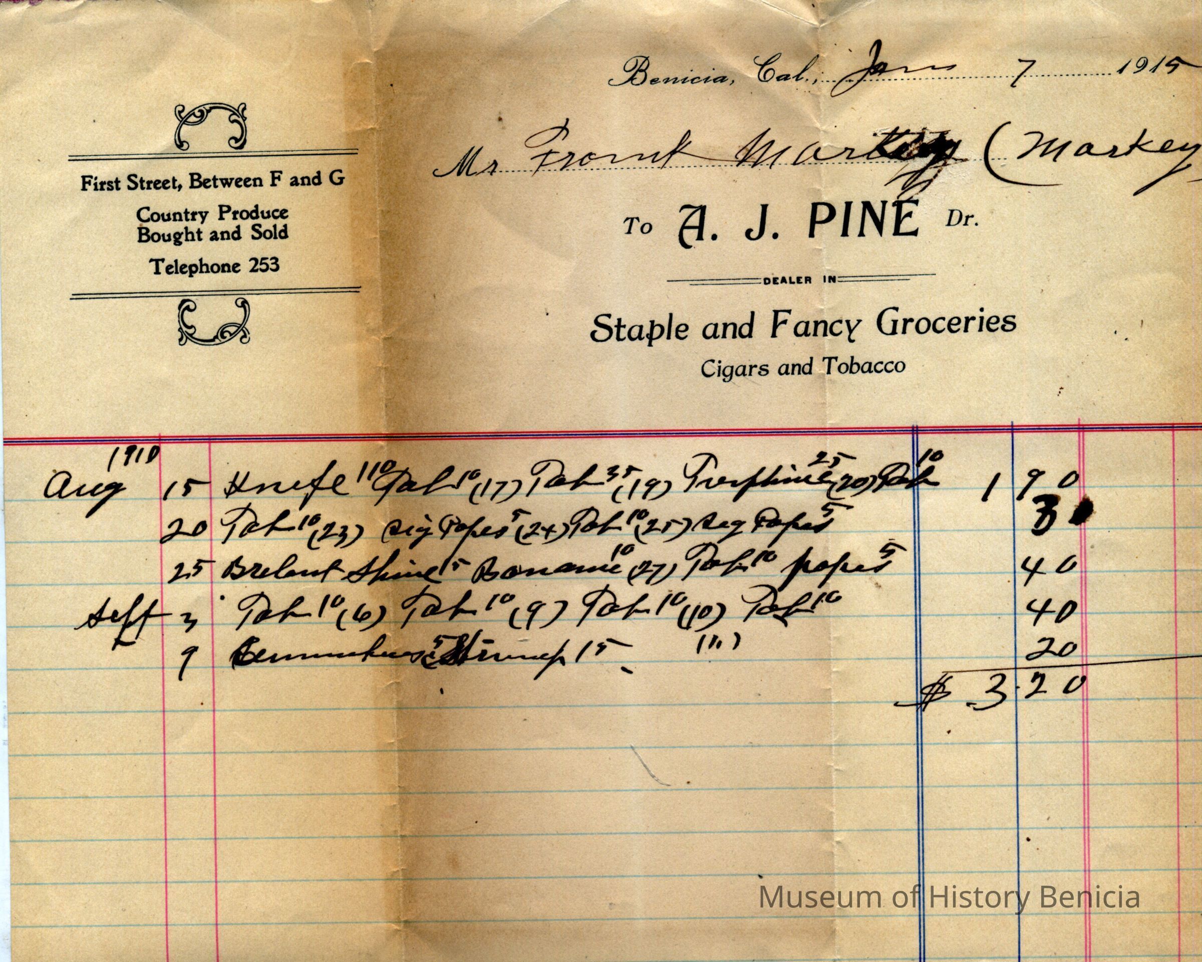 Receipt from A.J. Pine Grocery to Frank Markey for various purchases. 01/07/1915.